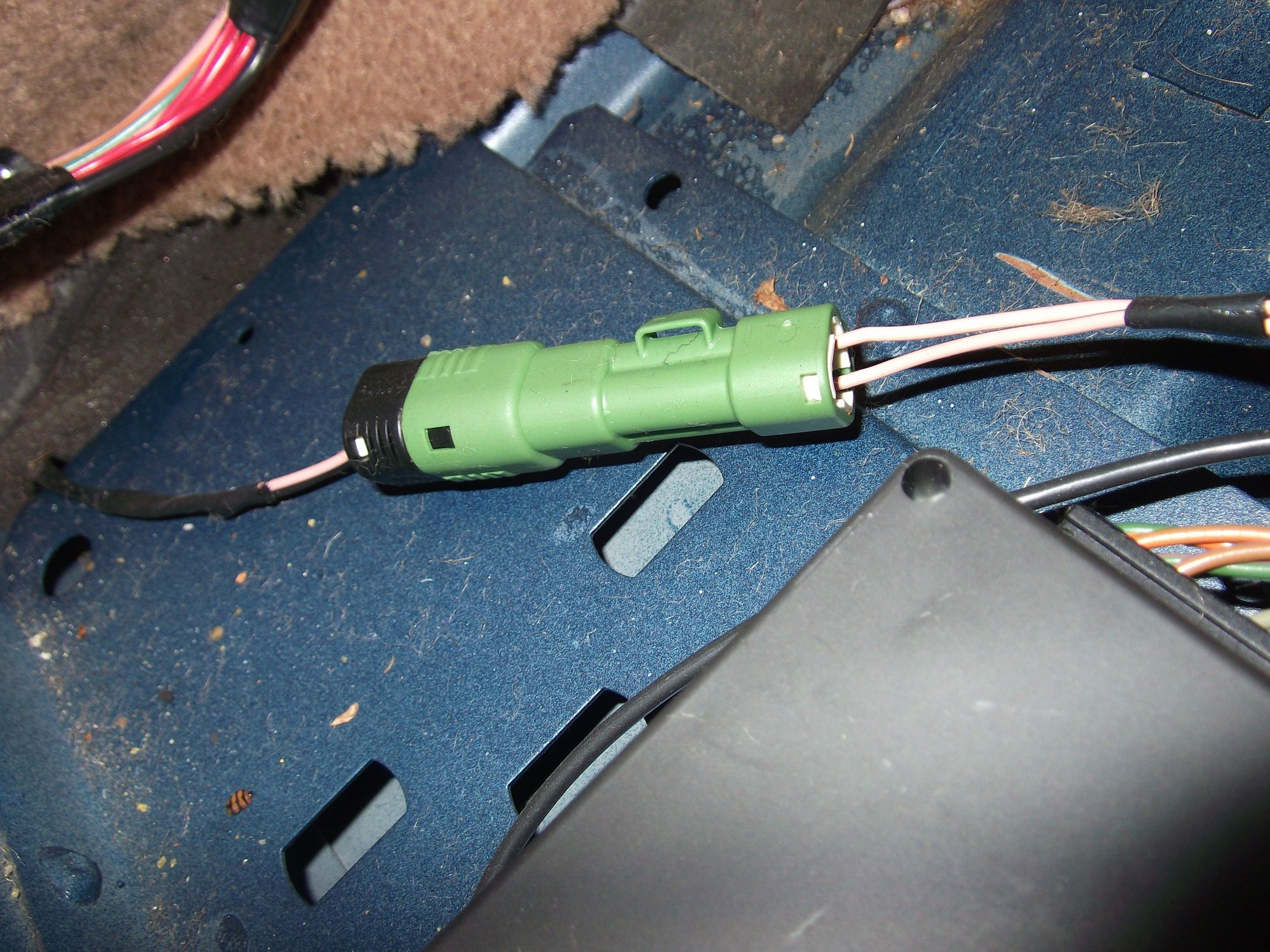 You have to remove the plate just in front of the seat that has carpet glued to it. Remove the forward carpet, and you will find two screws under a carpet flap holding the cover plate down. Then you can remove the plate, and the connectors for the seat harness. There is more than one.