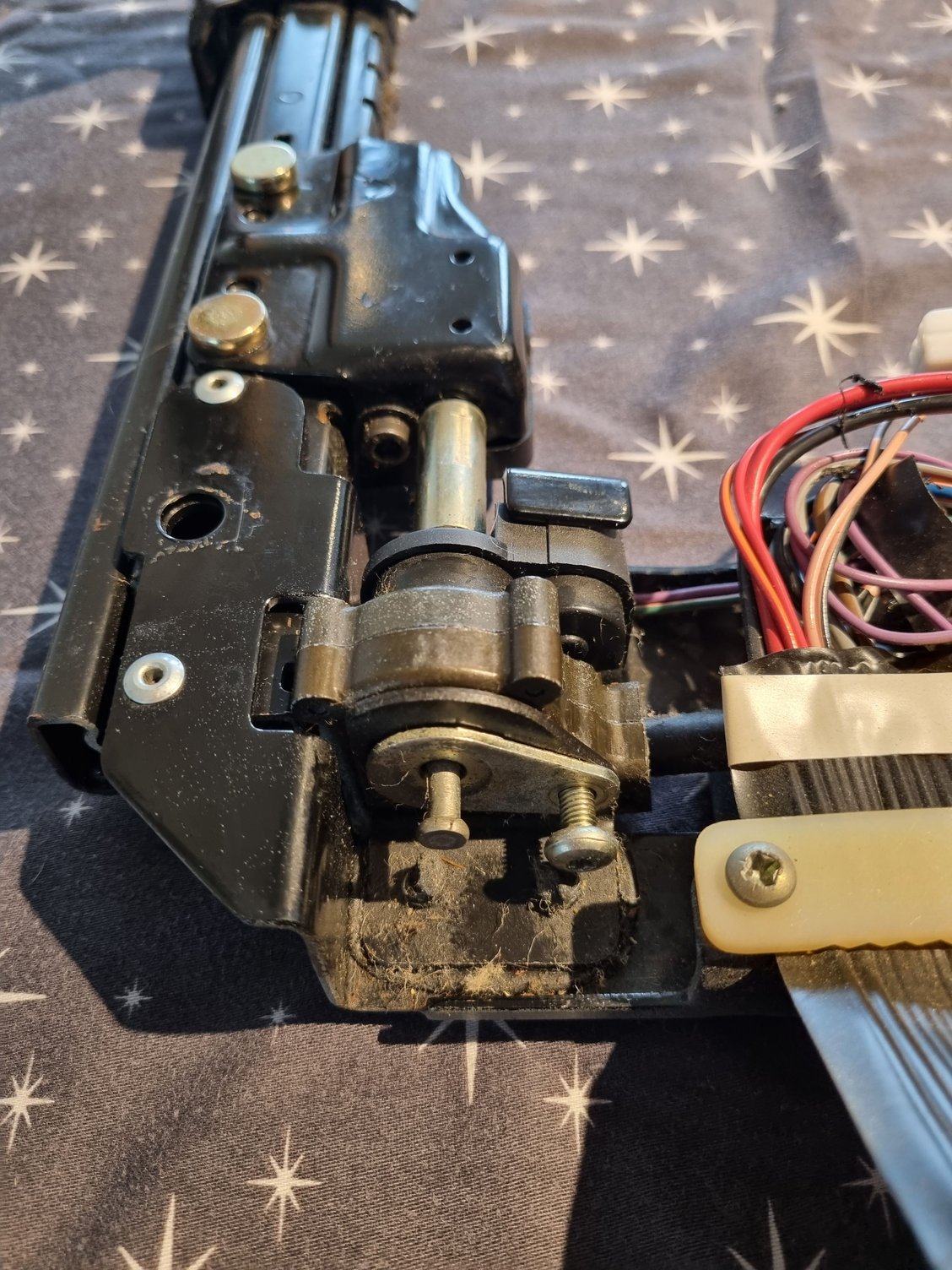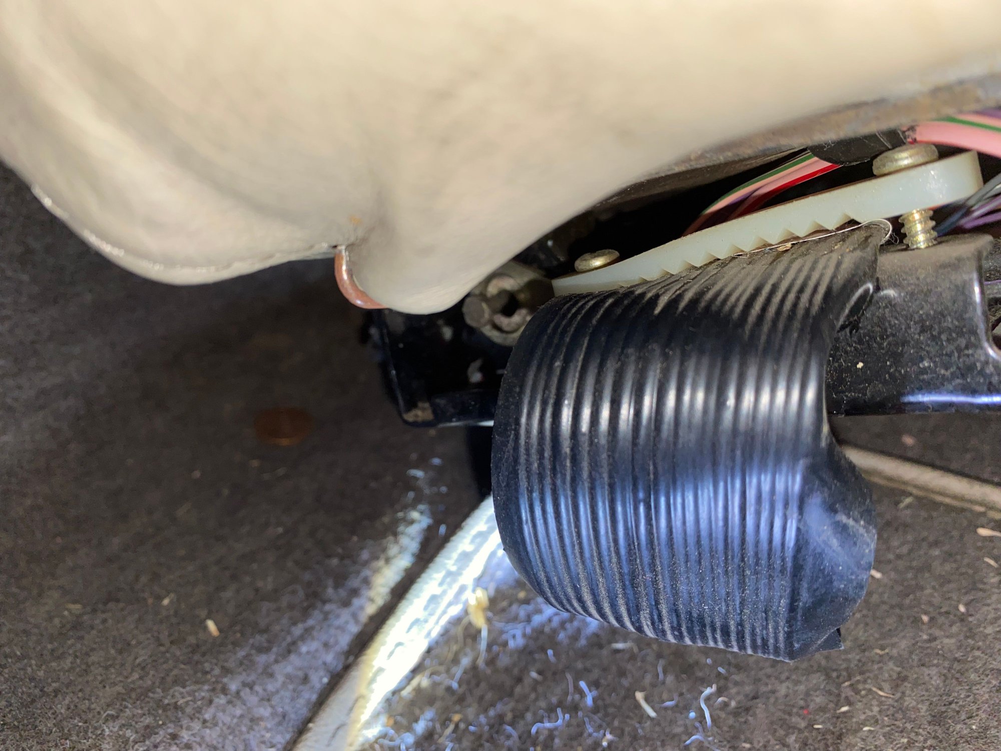 Tomorrow, I will see if I can just cut that screw that is sticking up and turn the clamp to the other side. The connector is just behind it. Then I will remove the clamp and use a tie wrap to secure it back to the frame. That way if I ever need to remove the seat again, it will be easy. I looked at pulling the rug up, but it is glued down and I would have to rip it up in order to get to the plate. The motor stopped working when I tried to move it back the last time, so I suspect it is jammed. No matter, they both go on my bench in the morning. It will be good time to give them both a good cleaning and go through both motors if possible.