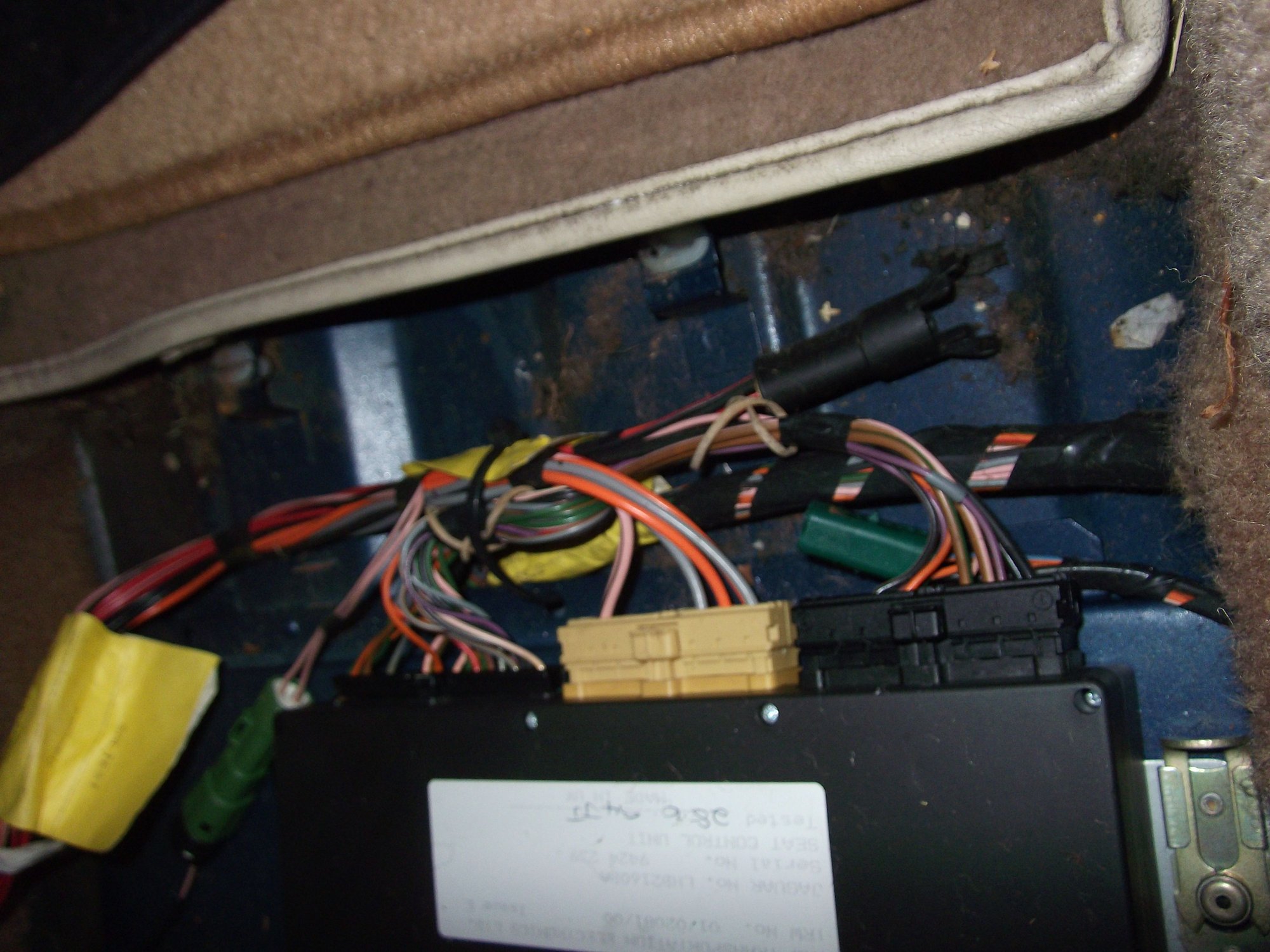 As mentioned, I think there's 3 connections. See the attached pics which show the seat ecu (under the carpet) before and after I disconnected it. That seems to imply there's one multi-wire beige plug to be disconnected, one black to green plug, and I think there's one other somewhere. The workshop manual explains it.
