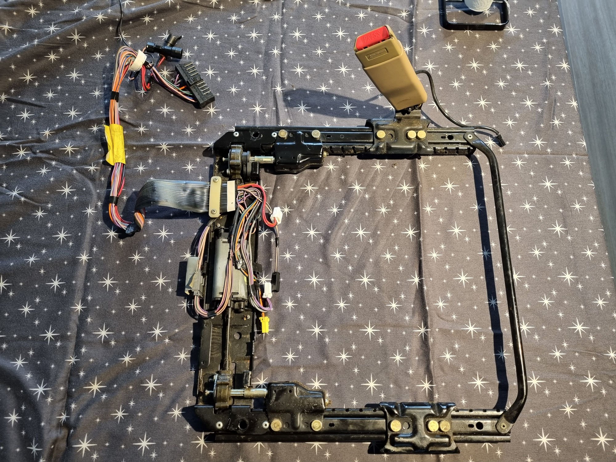 Ok, The plastic clamp if off and now out of the way. The harness is now disconnected. The rails are off the seat. I found two loose bolts jammed in the rails and they are now out. When the seat was in the car, the seat would only move a couple of inches then stop. Probably the loose bolts, but I want to make sure and test the motor before I put it all back together and in the car. If I also have a problem with the motors, I want to deal with that next.