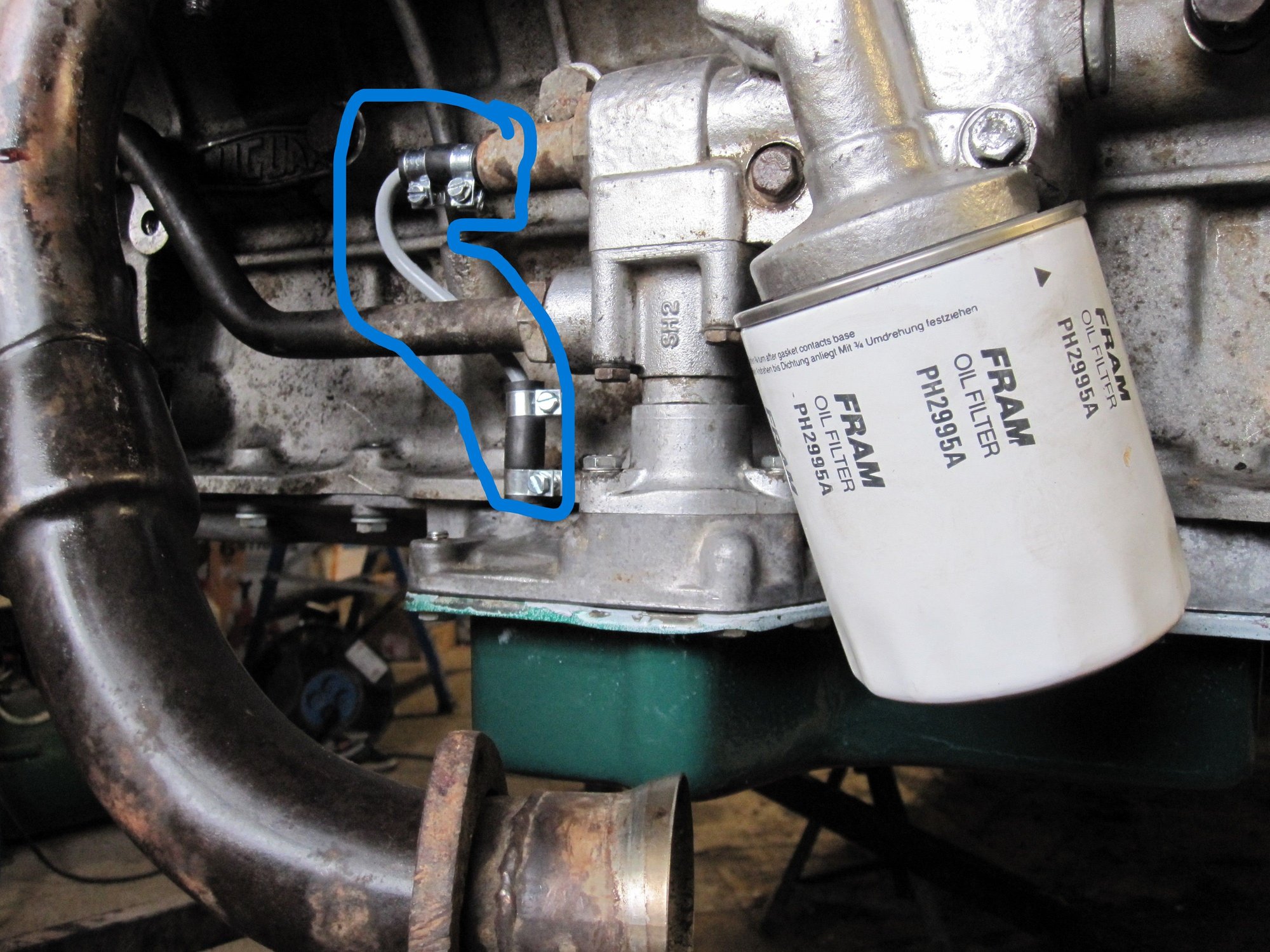 At the oil filter housing, there is a SMALL steel pipe, looks like a walking stick, with a 1/4" hose and clamps on each end. THEY LEAK BADLY. With Cats, LHD, I dont envy the access. Being we are RHD, and NO cats, access is TIGHT, and "feel" is the way to go. Oil filter removed helps a tad.