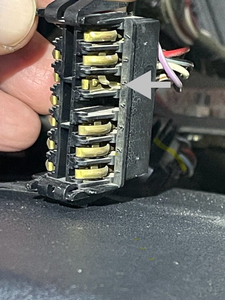 Few days later took off the cluster again for checking and noticed that one of the two wire plugs that connect to the back of the cluster, the one that fits behind the speedo had lost a piece of the curved brass bit which makes contact with the printed circuit, see first photo below.