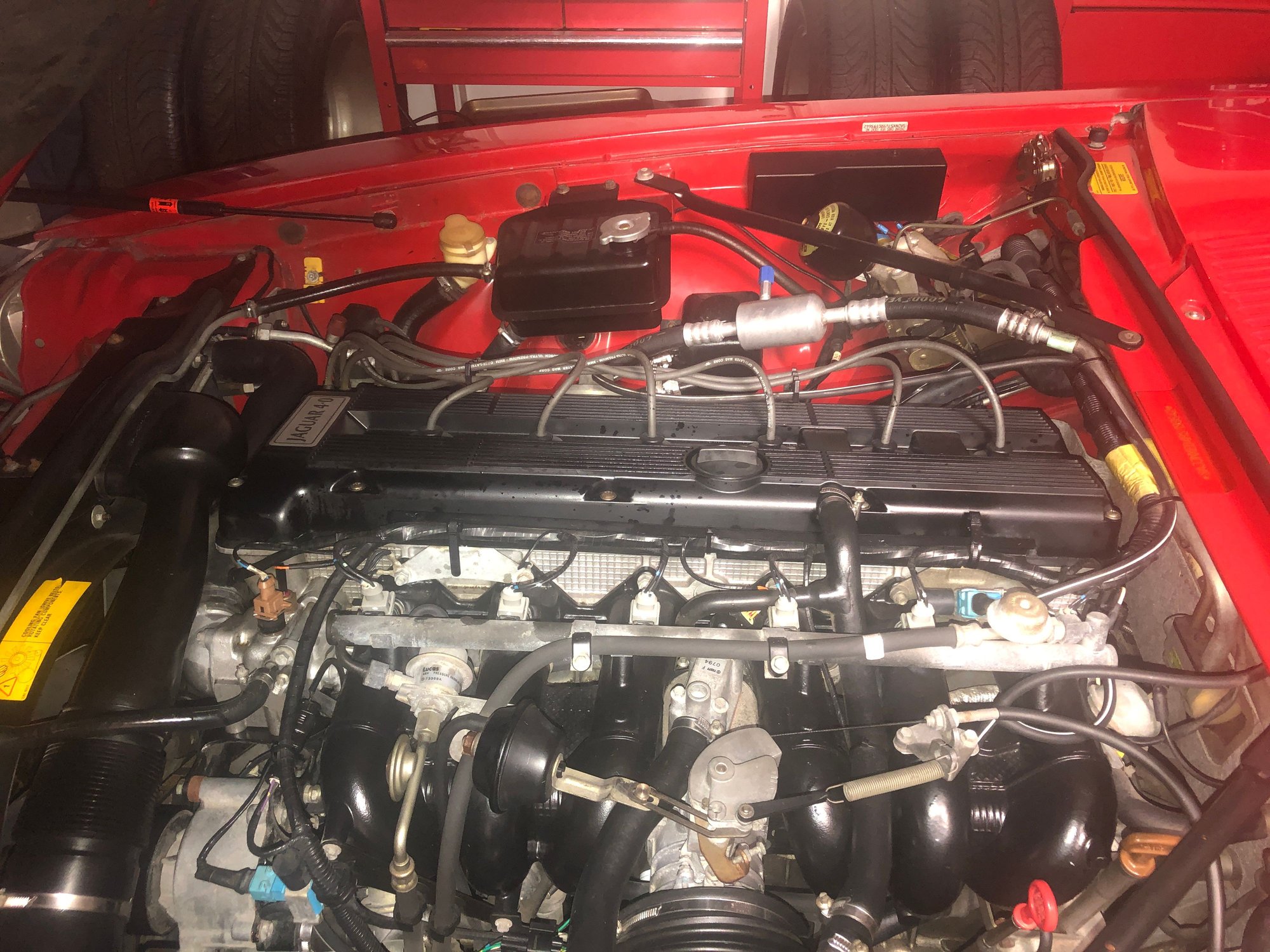 I have a question. So after replacing valve cover gaskets, spark plugs, transmission cooler lines and power steering lines 3 months ago. Along with fixing the AC system, i thought I would be trouble free for some time. Anyhow, today I decided to take the kids to get Ice cream and stretch the cars legs. I maybe added 5 miles round trip. When I pulled into the garage, I noticed a significant puddle of oil on the driveway. I looked under the car and sure enough there was a puddle of oil on the garage floor too. I popped the hood and oddly enough I have oil sprayed on the front part of the valve cover and it is puddled on the side of the block above the intake manifold. Needles to say, I am frustrated and feel like driving the car into a nearby lake out of pure frustration... It is always a PITA adventure with the Jag. I am enclosing a picture of the leak from the top. Do you guys have any idea of what would cause oil to leak from here? This is a 1994 Aj6 XJS.