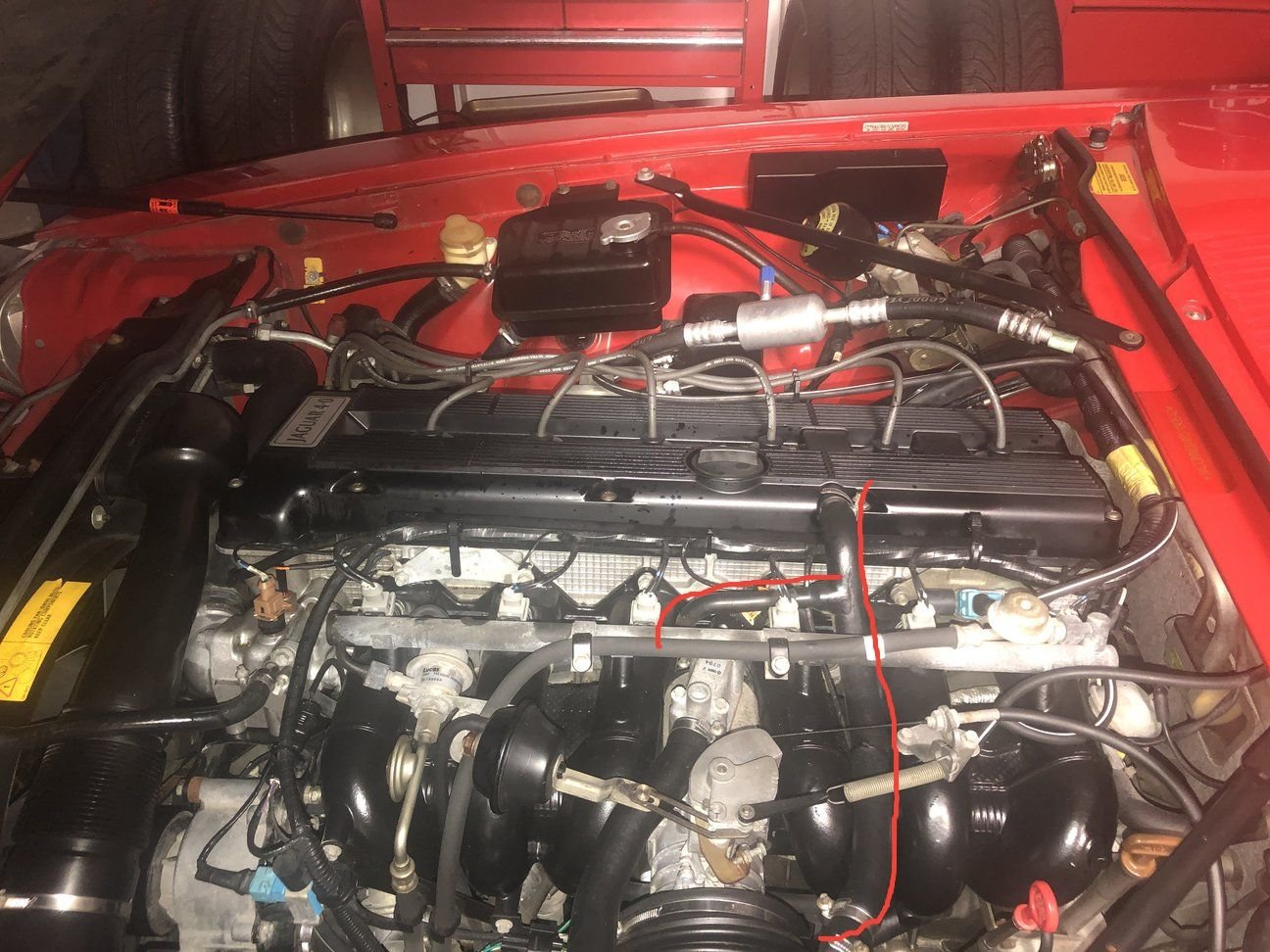 Thanks for the pictures.... I would be interested in the line traced in RED below.... On the V12 there is a vent similar to this that sends oil filled air (cranck case air) back into the intake to be burned, to relieve pressure (PSI) buildup in the engine (actually create a vacuum on a good day) and as an emissions requierment. Most v12 owners have removed them all together. Im not sure, and again I hope someone who is more familiar with your car will help me here, but perhaps there is some sort of "filter" (similar to the v12) that kinda sifts out the larger oil droplets before they make it unfettered completely to the the intake,,, drowning things.