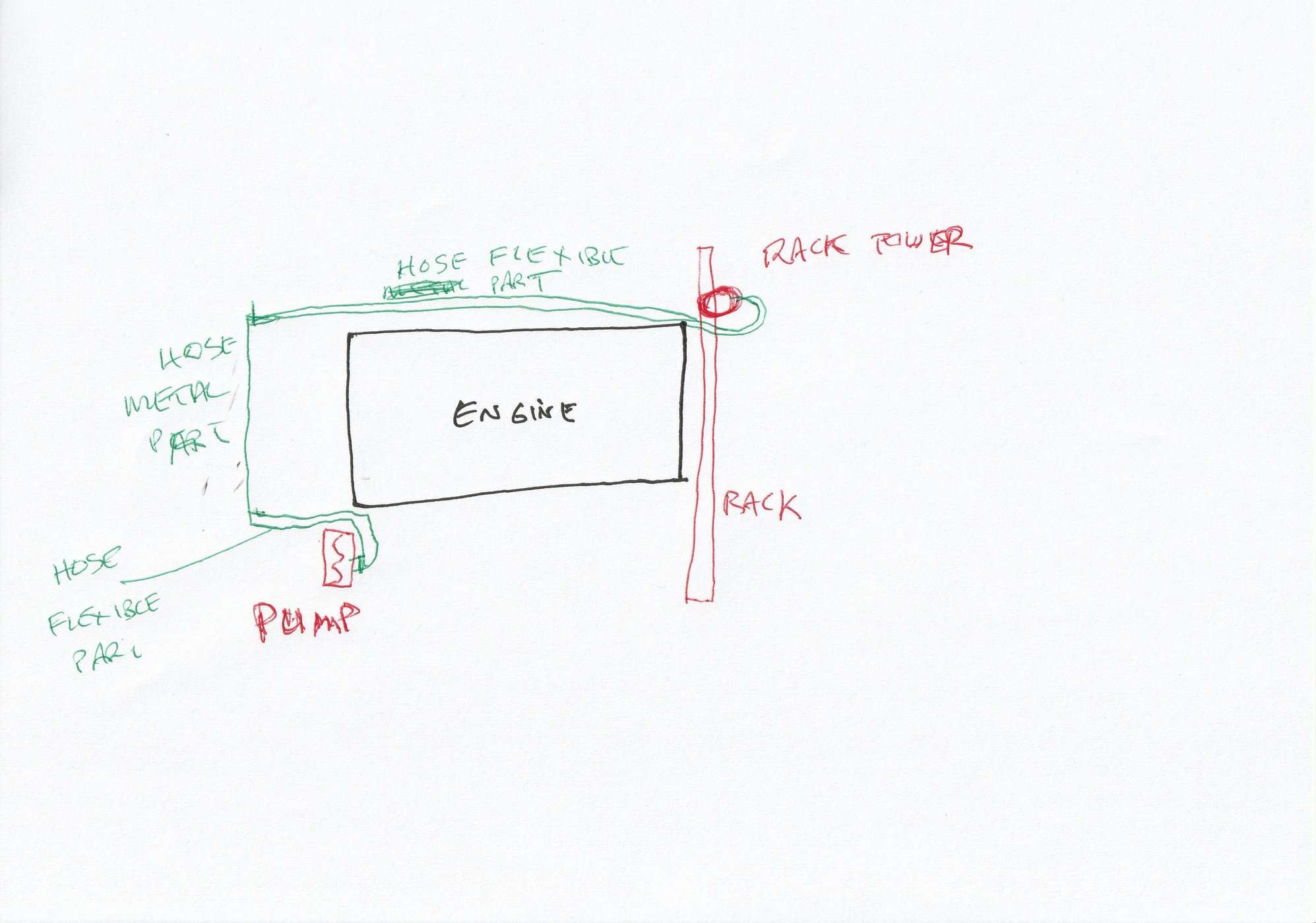 The following photos show the hose in reality: The front of the car is on the right in this photo. The photo shows the hose fixing to the rack tower (the hose connectors face rearwards on RHD cars). The hose flexible is bent through 180° and goes under the rack towards the front. I have protected it with a silicone hose where it goes under the rack.