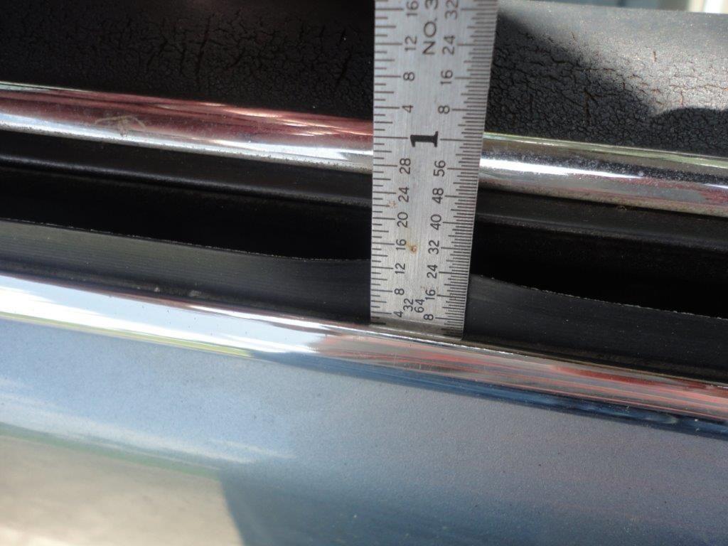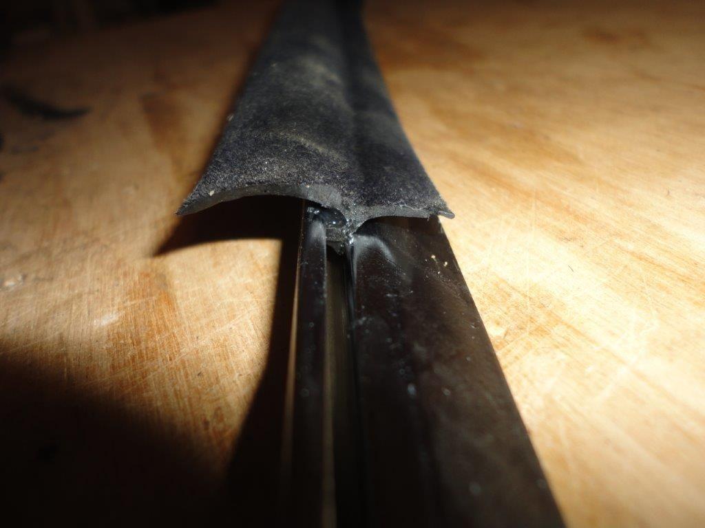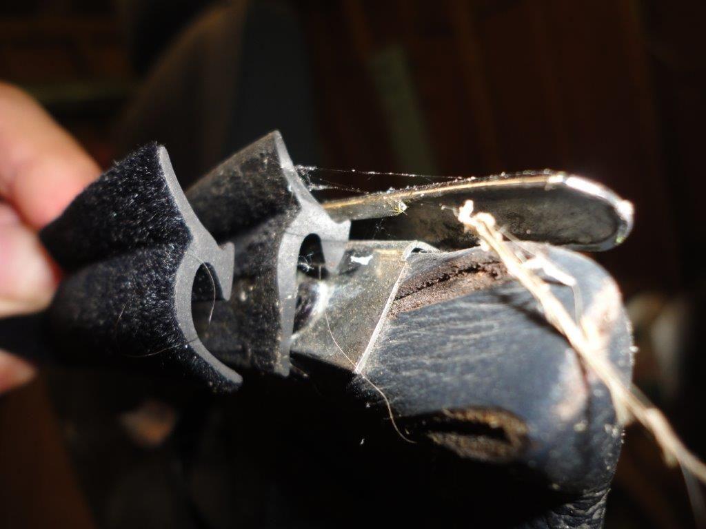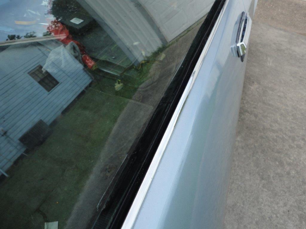 Anyone replaced these seals before, and is there some secret? Left side chrome strip with the short side toward the glass. Note the rubber does not touch the glass. This is the end view of the chrome strip that shows the channel that the seal is supposed to slide into This shows the seal slid about four inches into the channel with the long side ready to contact the door glass.