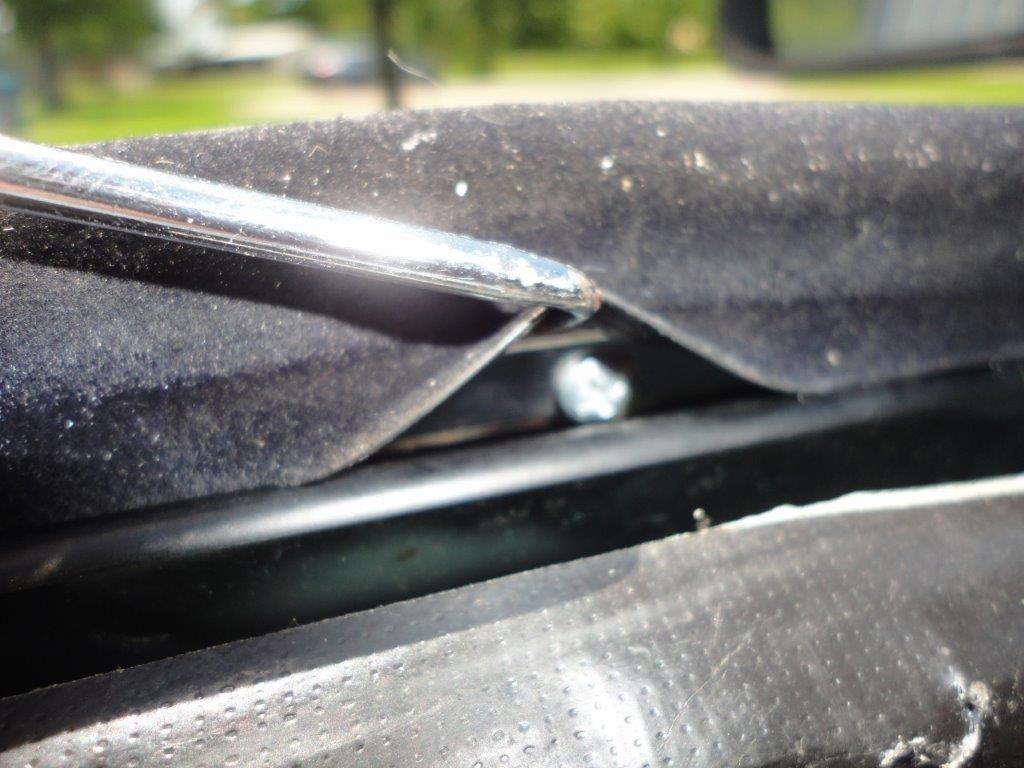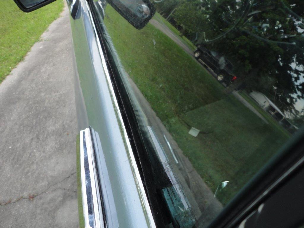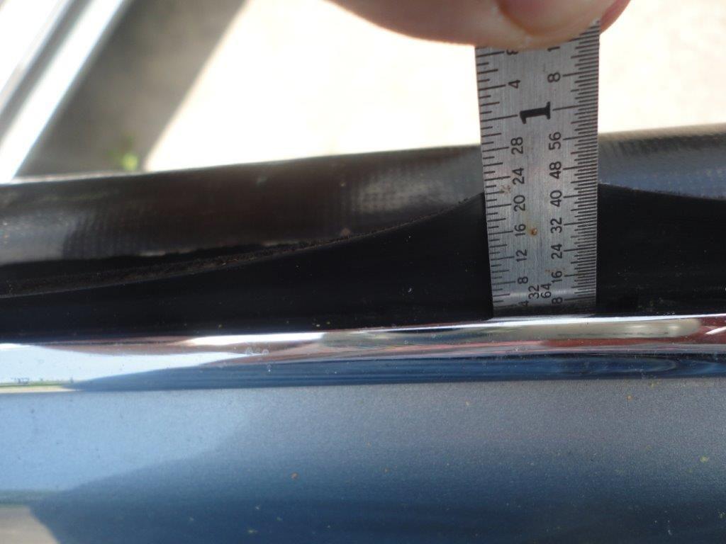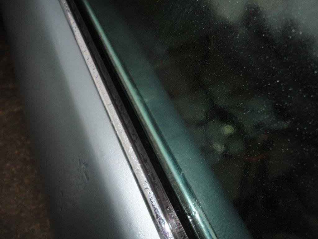 Anyone replaced these seals before, and is there some secret? Left side chrome strip with the short side toward the glass. Note the rubber does not touch the glass. This is the end view of the chrome strip that shows the channel that the seal is supposed to slide into This shows the seal slid about four inches into the channel with the long side ready to contact the door glass.