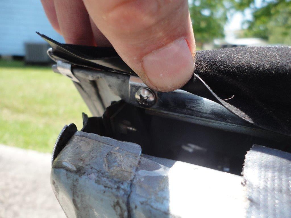 End view of Rubber showing long and short side of seal Passenger door showing short edge of seal at the top, which does not touch glass #8 3/8 sheet metal screw securing seal retainer to door shell on left door #6 3/8 pan head sheet metal screw securing trim to door shell Seal and retainer reinstalled showing rubber curling away from glass View from opposite end