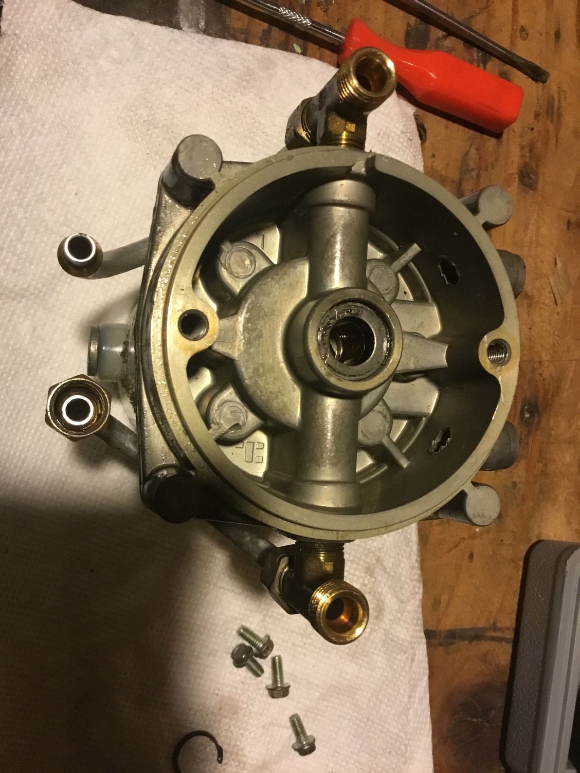 Finally got the pump off tonight. Removed the electric drive motor. Removed the 4 bolts holding the reservoir on. Removed the circlip from the shaft.