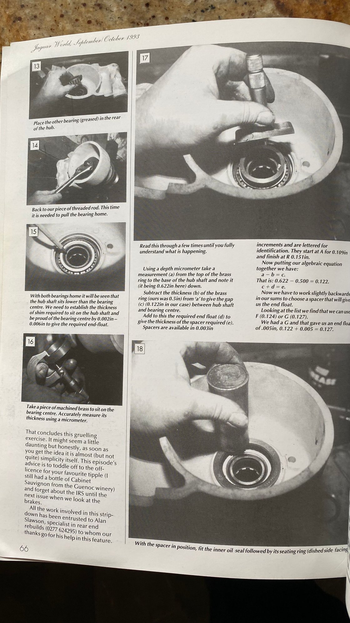 I take your point about calipers and dial guages, but the key for me is passing a straight edge across the installed shim and bearing inner,as I describe in Post I point 8, and remember the bearings will have been tightended onto the driveshaft beforehand, as in step No. 4. It is extremely easy to see if one or other of the two surfaces is proud, and thus adjust the extra aftermarket shim to suit.