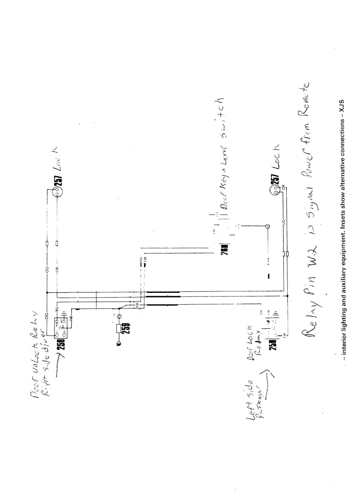 Here is my walkthrough of easily adding a remote to an older '80s xjs. Had to make one myself since lock relay location and operation are almost impossible to find on the web. First, remove the outside kick panel cover on the left and right side. There will be a cubby hole behind it with a group of wires inside. just above cubby are 2 screws. remove them and relay tucked up at top of hole will be able to be withdrawn. take note of the color of wires and the pin numbers they attach to. schematics usually do not match what is there, close but not quite. You will see the pin labeled W2 on the relay That is the + trigger to activate it. The relay in the right side cubby is for unlock functions. the Left is for lock. Get a pack of male and female spade connectors., cut a 4 inch piece of wire for the splice( can be smaller gauge due to short length) Take wire strippers and in center of wire strip about 3/4 inch. do not push insulation all the way off, fold striped area in half and crimp male spade connector on, and then female to one of the loose ends. the remaining end is your wire for remote. You will need 3 of them made up. 4 if you don't want to mess with ground point. insert the taps between wire and relay on W2 for signal on both sides. on right side passenger, place a tap on C2 (center pin) for + power feed for remote. W1 can get a jumper also for ground, the ground point is at buttom lip of cubby if you just want to use eyelet connector. Now take out your remote control box. splice wires or move switches so it will send + pulse to the lock and unlock wires. attach the lock wire to the W2 tap you made on right hand relay. The + power fused wire gets attached to your C2 on same relay and _ ground can get attached to the ground screw or a tap on W!. Now the hard part, fish a wire between the 2 cubby hole on both sides. right side attaches to the unlock wire on remote and left side attaches to the only tap on that relay on W2. Now grab your key fob and click. hear that happy chunk sound ? If not, check the configuration on your remote box. Take the remote box and pack it into the right cubby hole , tape the antenna wire on out side of cubby