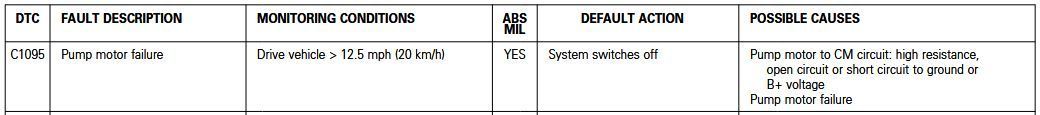 C1095 relates specifically to the ABS pump motor or its electrical circuit. Here is the definition and published possible causes. At the time the engineers prepared the DTC Summaries, they were not yet aware that the Ate ABS modules were going to have so many issues with starved, cold and cracking solder joints: