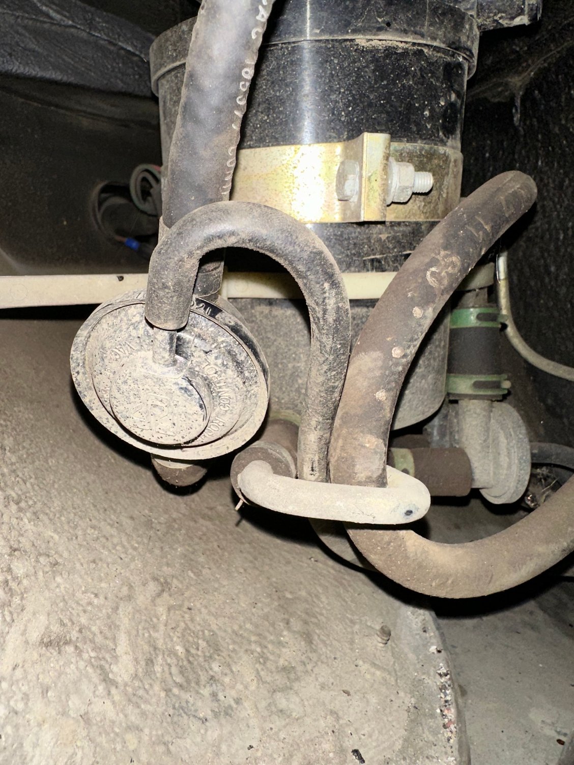 Yes, really. This is a photo of the thin tube that runs behind the tank and then exits the chassis in front of the LHS wheel. It comes out of the evaporative cannister tubes up in the RHS buttress, via a Rochester valve on UK models (that will most likely not be there on your model as it had on in the front instead).