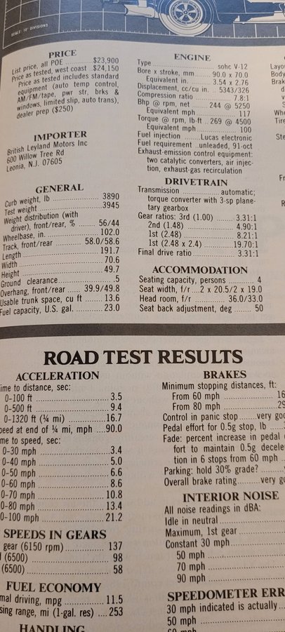 While rereading a R&T mag from 1979 I came across a test of the then-new XJS: V12, 5.3L, low compression, smog, all the normal stuff of that era.