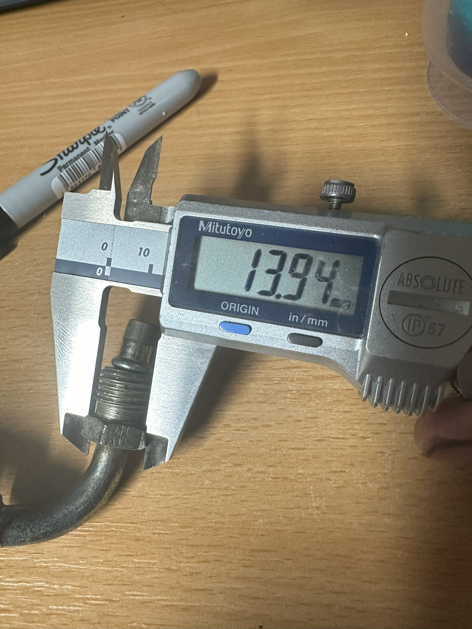 Could someone confirm the size of the fitting at the main tank for the expansion tank return line? First time pulling a fuel tank. 1/2" too small, 9/16" too large; 13mm too small 14mm too large. What the heck! Sorry just can't find my adjustable wrench at the moment and curious.
