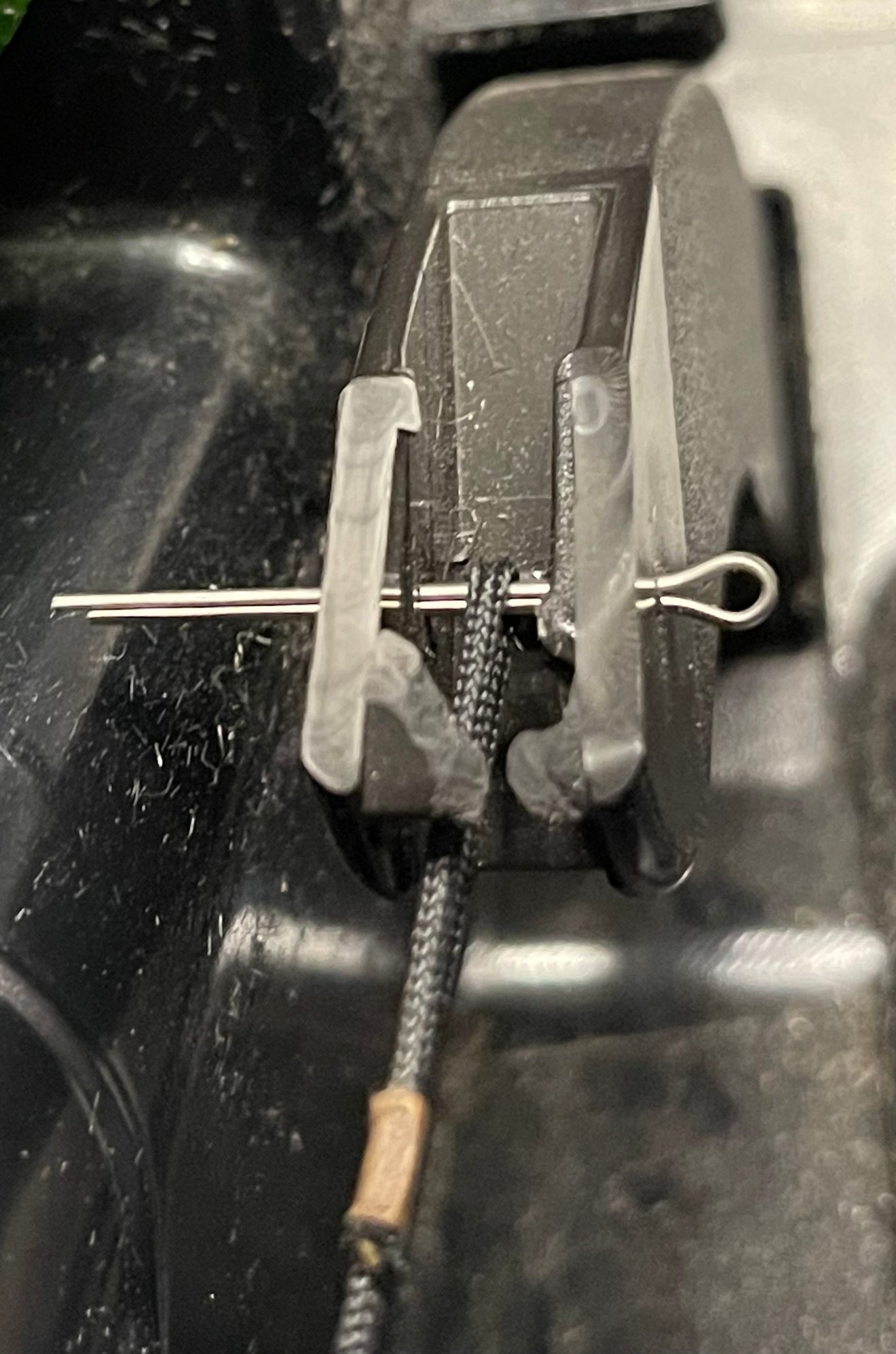 As you've likely seen, once you get the glove box out drill a hole and use a cotter pin through the loop in the string as shown below. Be extremely careful as I found the glove box to be very fragile.