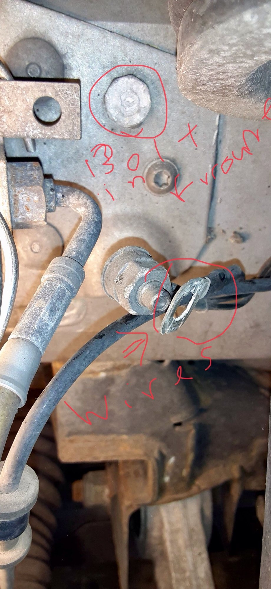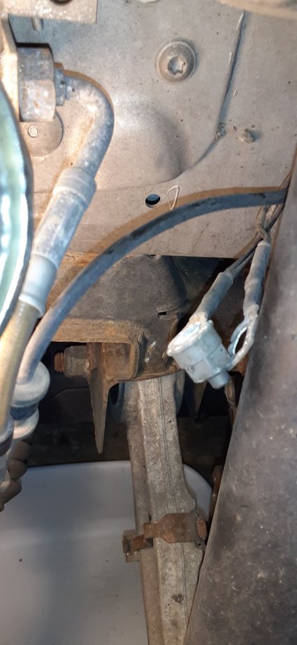 I pulled the right wheel, and just to the inside frame, near the shock, is a Bolt, or inserted lugwith two eyelet grounds, going into the frame body. I had hoped that they would just need to be cleaned and a bit of DeOxit applied. But, as I attend my 12mm socket, to loosen the nut from the frame, the nut and threaded insert, literally fell off, with the grounds attached .(see photos) the red circling shows where the frame attachment was and the grounds. the Yellow circling is the new temporary negative cable, attached at a second frame bolt.