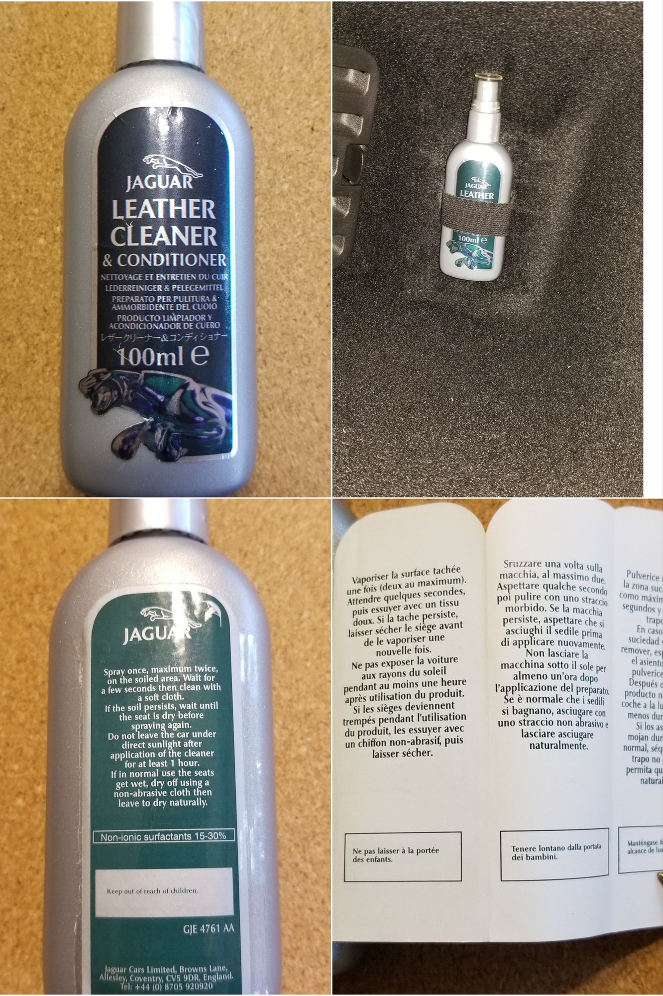My 2009 XKR Portfolio convertible came from the factory with this small spray bottle of leather cleaner and conditioner in the trunk. (boot).