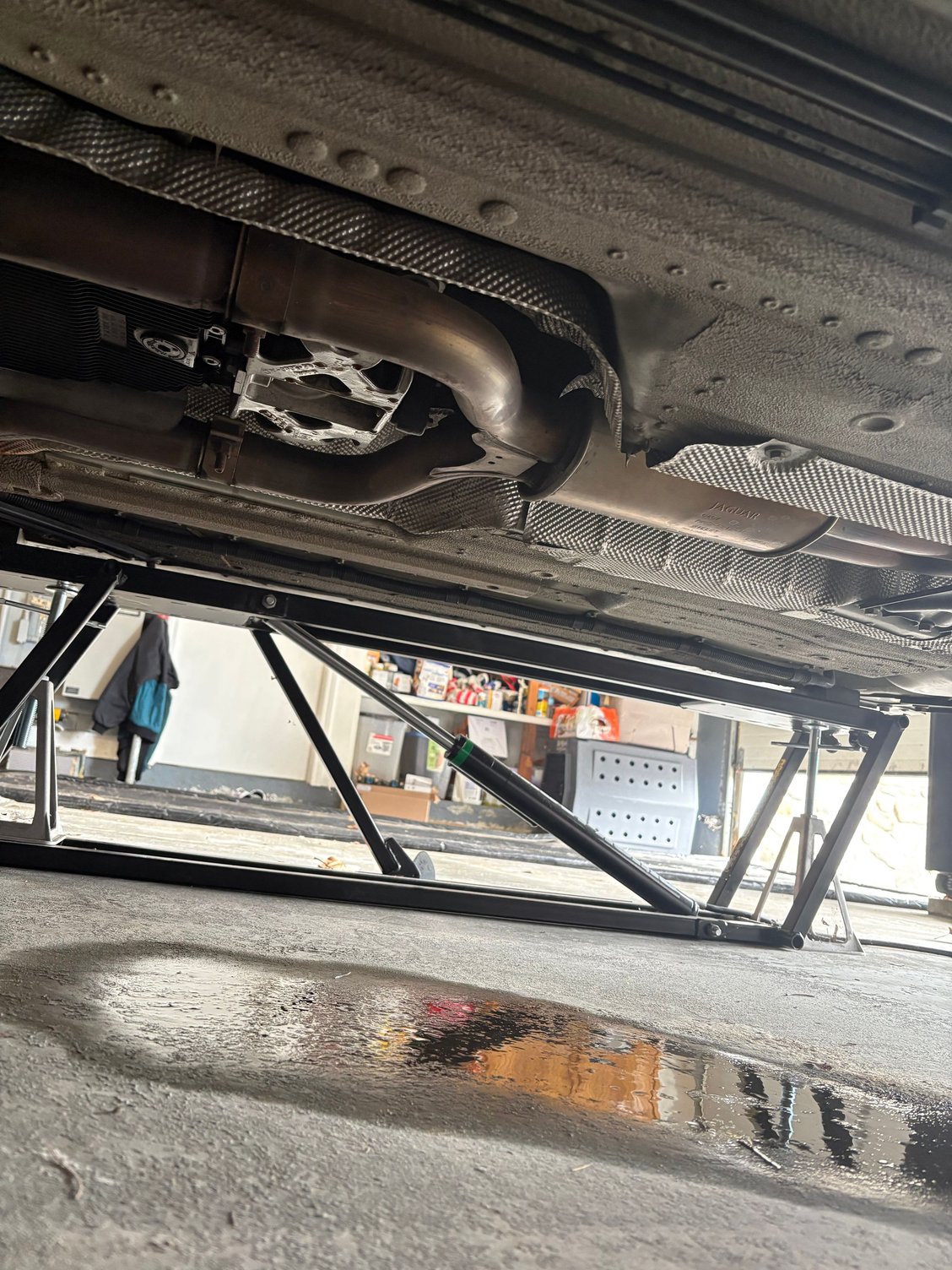 I have had my 2007 XKR up on the quick jack for a few weeks now, will be replacing front shocks and some other suspension parts. Car has not been running at all while up there. Today I notice a big pool underneath. Have not gone under yet but it looks like it dropped from the area around the back of the transmission pan. Could it be the pan just started leaking all of a sudden?