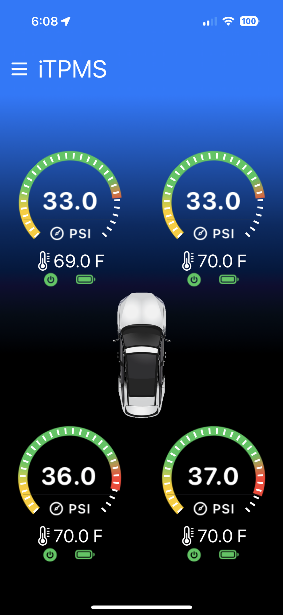 @arenaej do you set the alerts ao you don't need to keep the app on screen? Also I noted the temperature. Is that the air temp in the tire I presume. Still pretty warm. You're prolly out golfing again too. Son of a b....