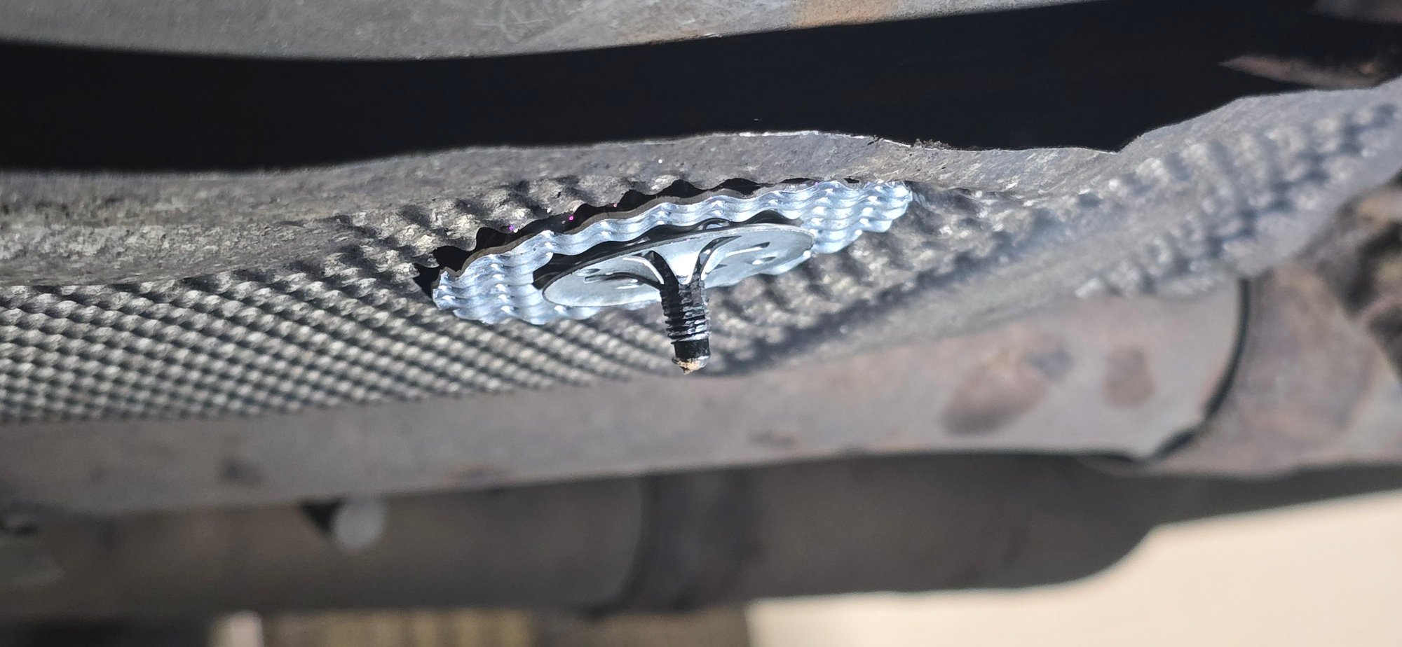 I bought a heat shield repair kit which includes aluminium discs to repair the heat shield and push on retaining washers.