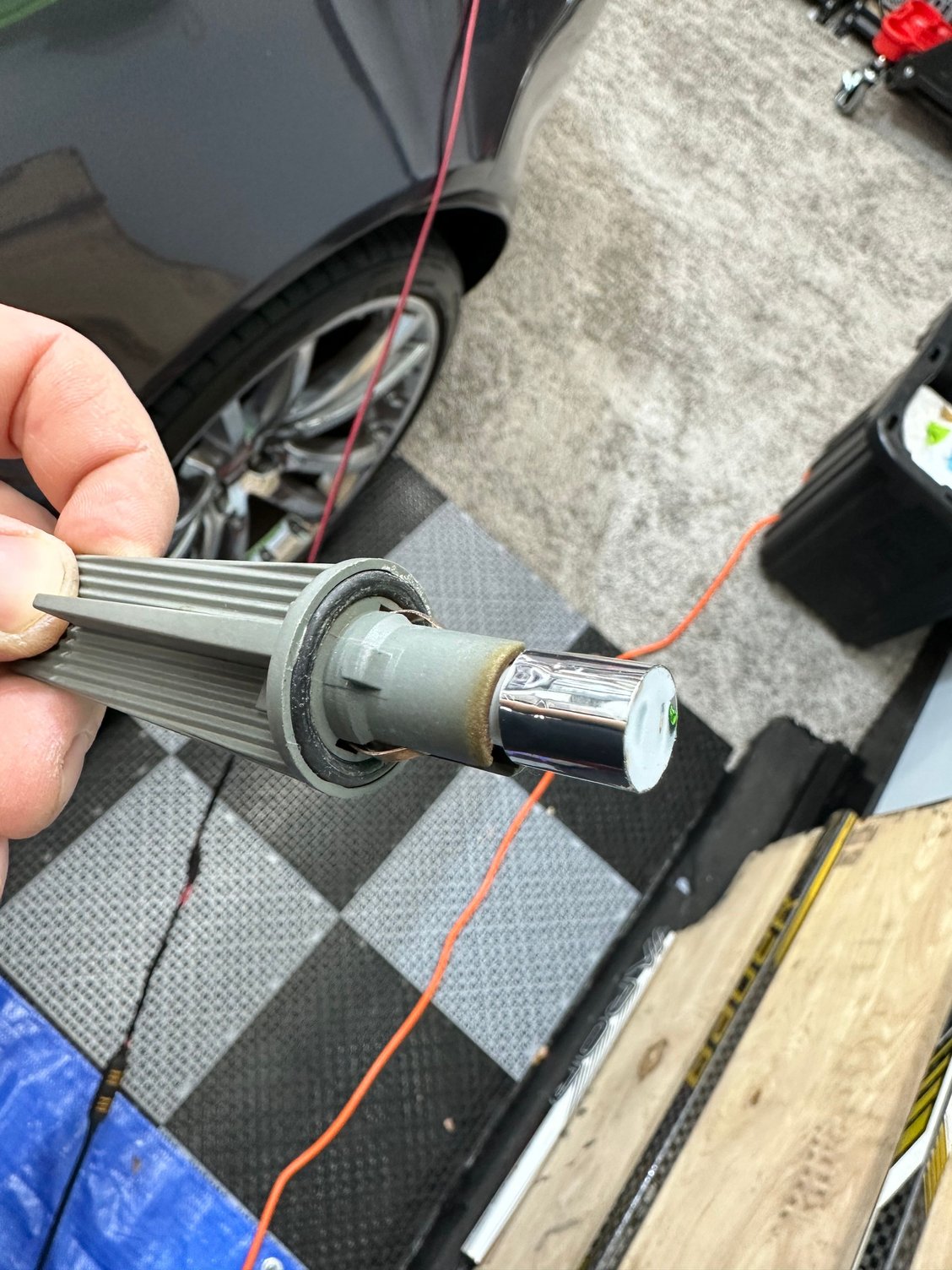 - 60mm: run the wire through the drilled hole, add enough adhesive on the outer edge of the lights, and carefully set in place - centered around the turn signal bulb hole