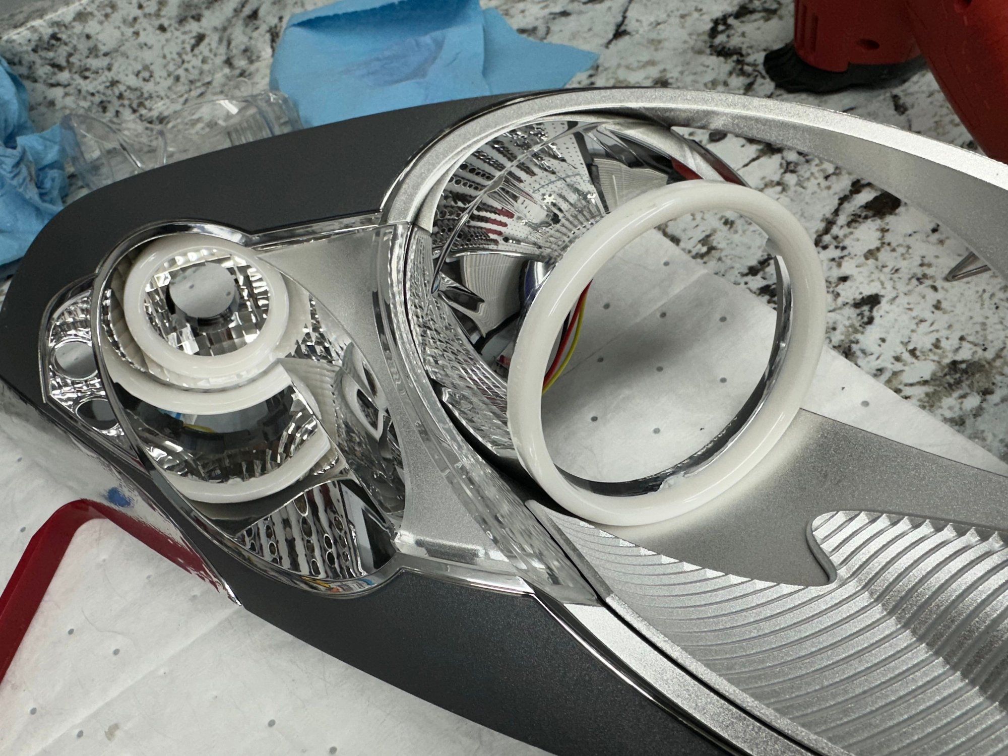 9. USE EXTREME CAUTION when wiping off excess glue... the chrome on the shrouds comes off VERY VERY easily. Even just a wipe with a cloth will scratch it up and remove some of the chrome.