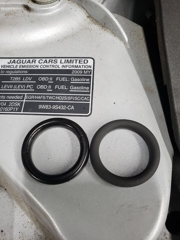 Jaguar will sell you a new tube with an o-ring attached for the very reasonable price of $25. But I thought I could do better. After measuring the old o-ring with my calipers I went to McMasterCarr.com and started hunting for o-rings that are 37mm OD, 27mm ID, and 5mm thick. 1295N629 is a Viton o-ring that is just over $6 for a two-pack and is the perfect size for this application. The old one is on the left and the new one is on the right.