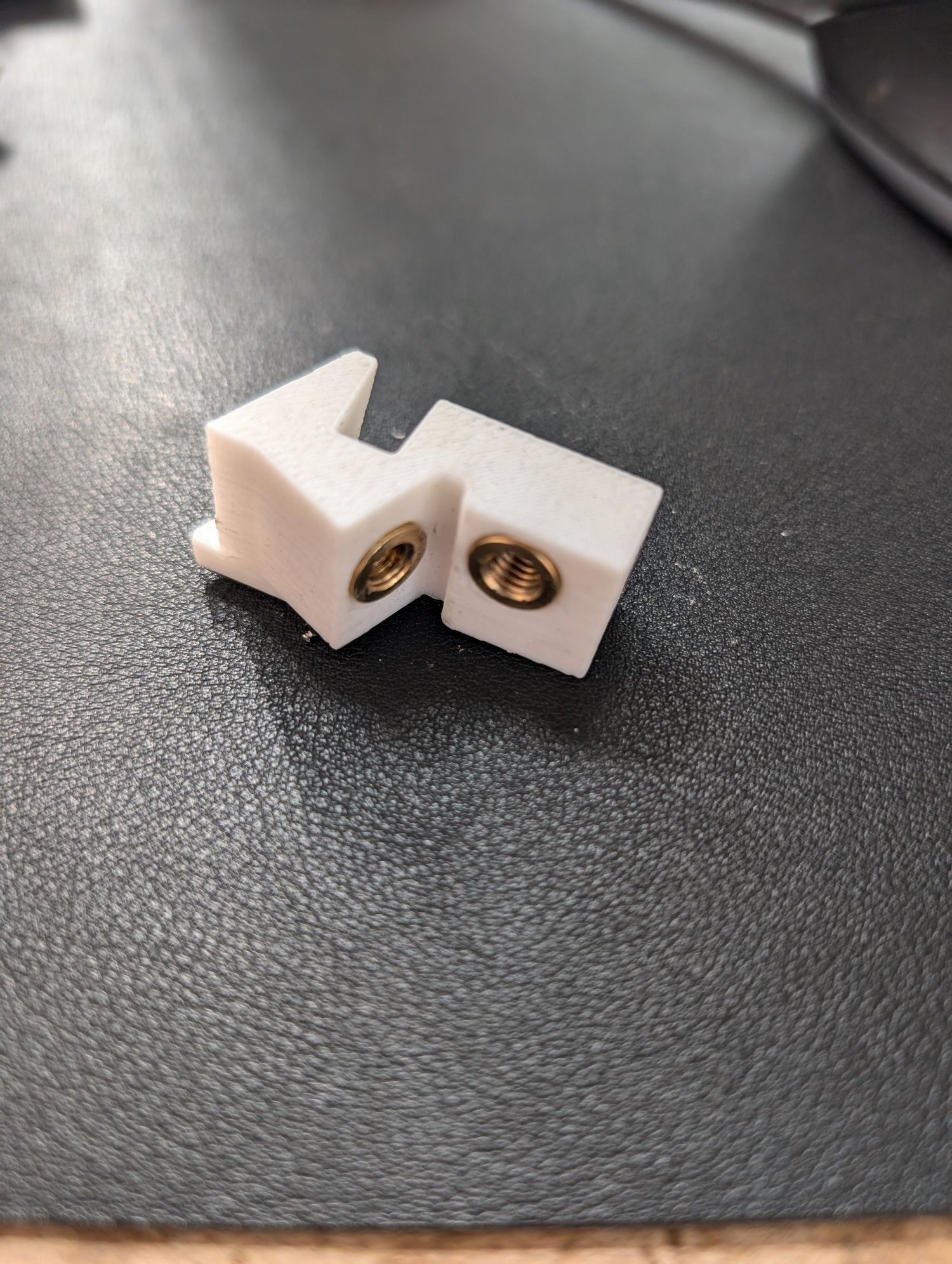 I finally got round to getting the flanged M5 threaded inserts. I have fitted them into the test bracket, they have a good interference fit. The bolts also have an interference fit due to the clamping from the insert compression against the walls of the bracket holes.