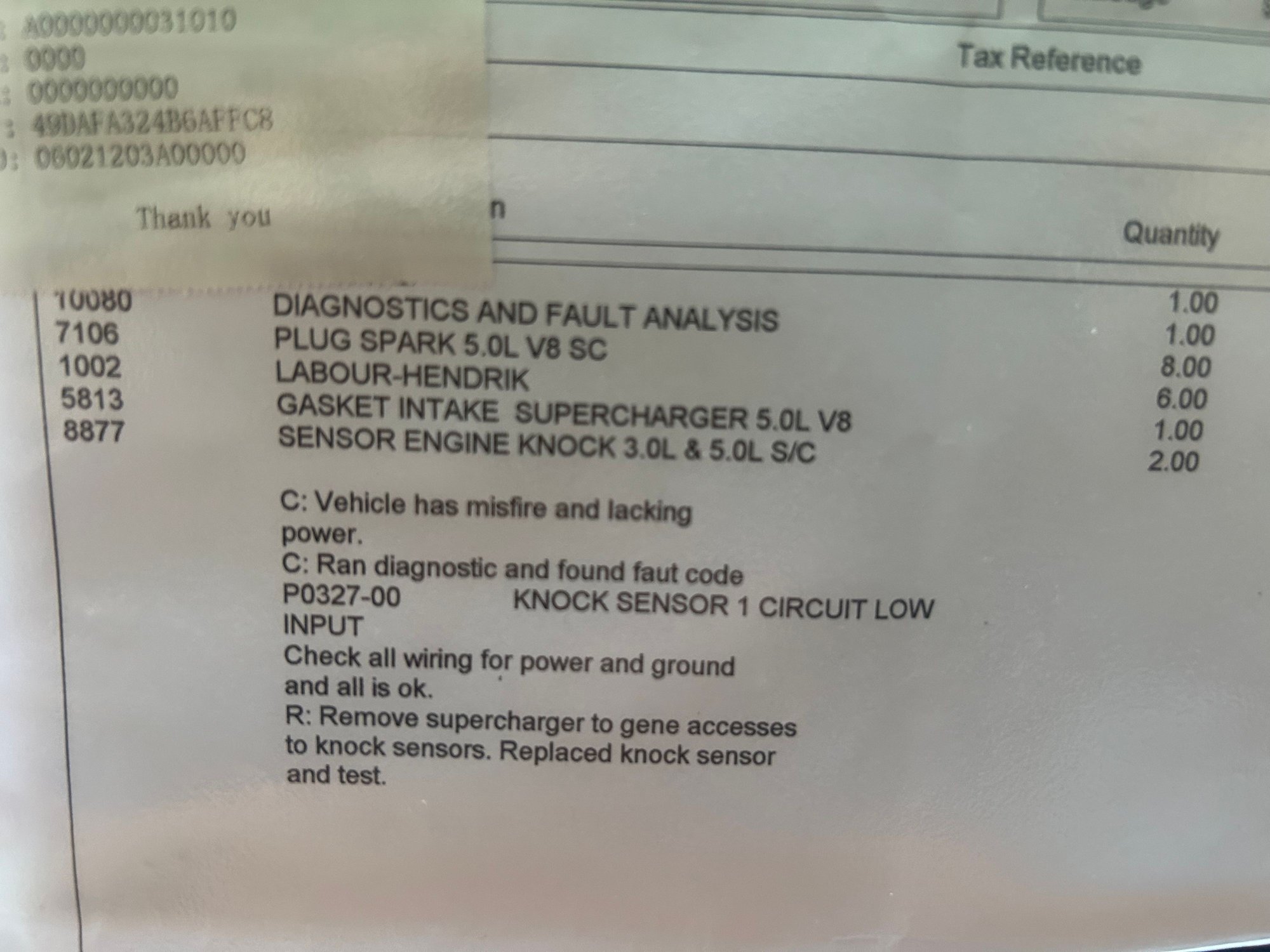 Not quite sure why everyone is stressing over the standard of the shop and what they did or did not do? I merely wanted to post my experience with the random misfire in the hope it may help someone else and what has solved it at least so far… particularly as I had not seen knock sensors mentioned in connection with a misfire. After all is done and with the claim on my extended warranty paid out it cost me 500 bucks to solve a random misfire. It’s so nice to drive without the misfire again! I will post a pic of the bill.This is a large indie JLR shop with probably 40 vehicles at a time, mostly LR but also Jags.