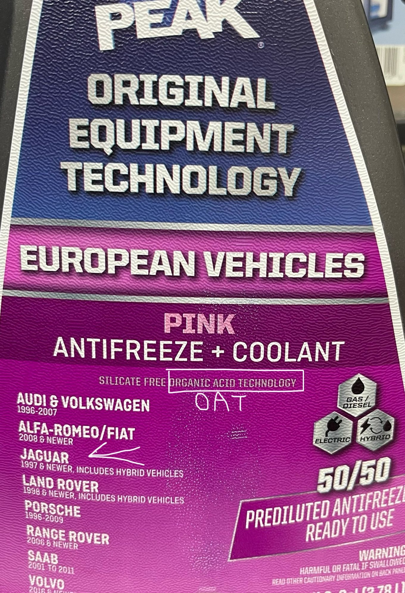 ASTM D3306 is the standard for passenger cars. Your bottle should say both ASTM D3306 and must say OAT on the bottle. Not IAT, Not HOAT, Not OATS, Not "hey works like OAT." Some IAT coolants do come in pink or violet. They are inorganic and not to be mixed with OAT.