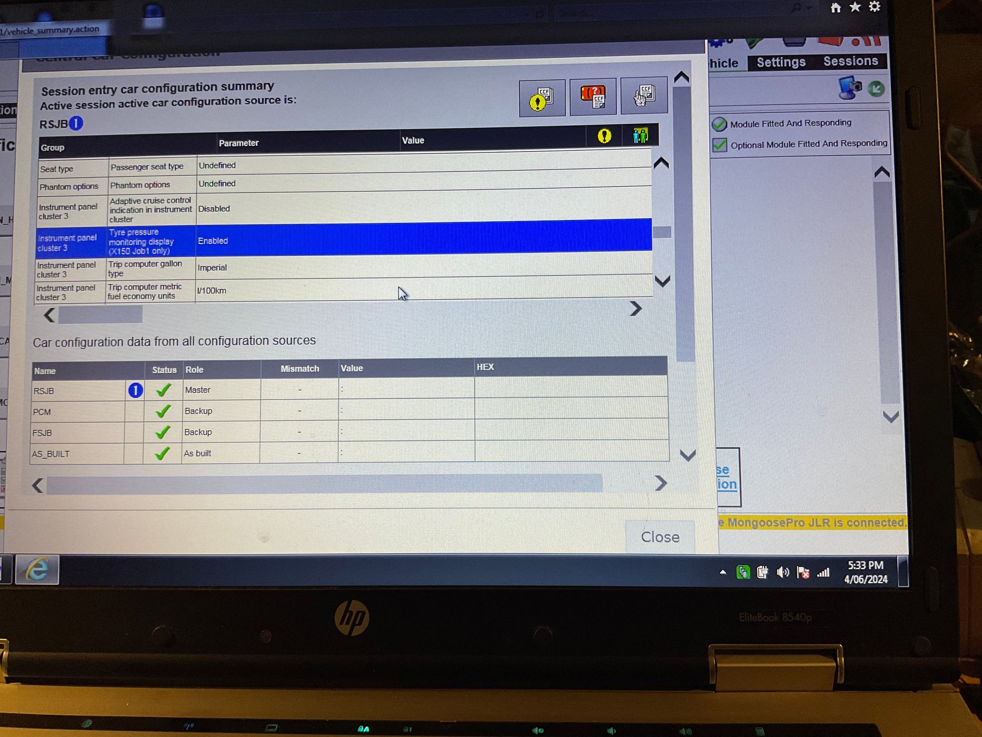 Hi to all from Queensland. I have a 2007 XK which is plagued with TPMS issues. I have tried new modules, sensors without success. I am trying to disable the system but can’t make the last switch on SDD. I have SDD v160 and a working Engineering access password generator. I get into engineering mode and the CCF files but although the parameters can be selected I do not get the selection on the lower part of the screen. See my photos (taken on a desk for the photo so battery is red, it is green when on the car with a power supply connected).