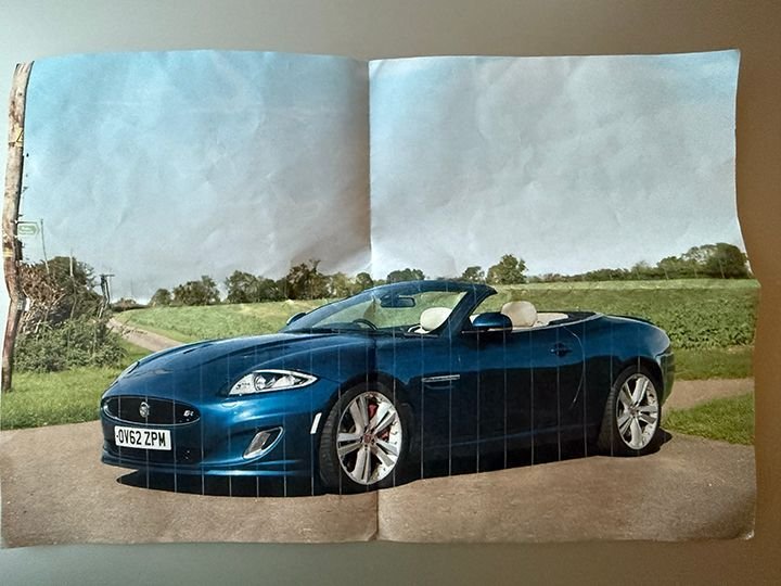 I've pursued a dark blue exterior/light interior color combination for a long, long time. Here's the Kyanite Blue XKR I've had folded in my suit's breast pocket I've been walking around with.