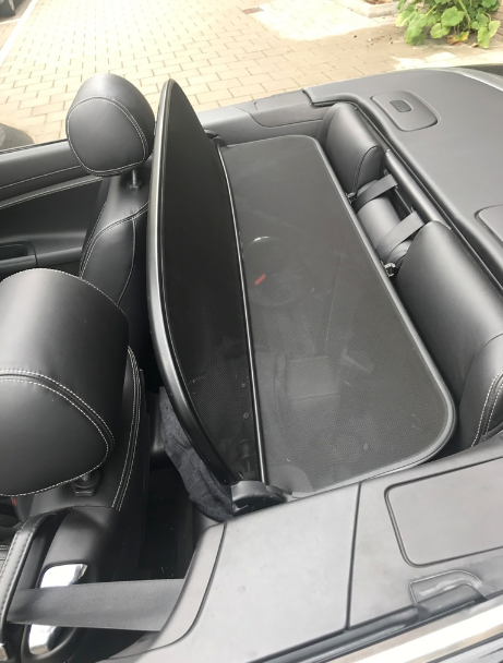Is it the OEM Jaguar accessory or an aftermarket rear windscreen? Are there any adjustments for the spring tension? How old is it? Does it attach with spring-loaded fasteners on the sides and pins between the rear seats? Please attach photos.