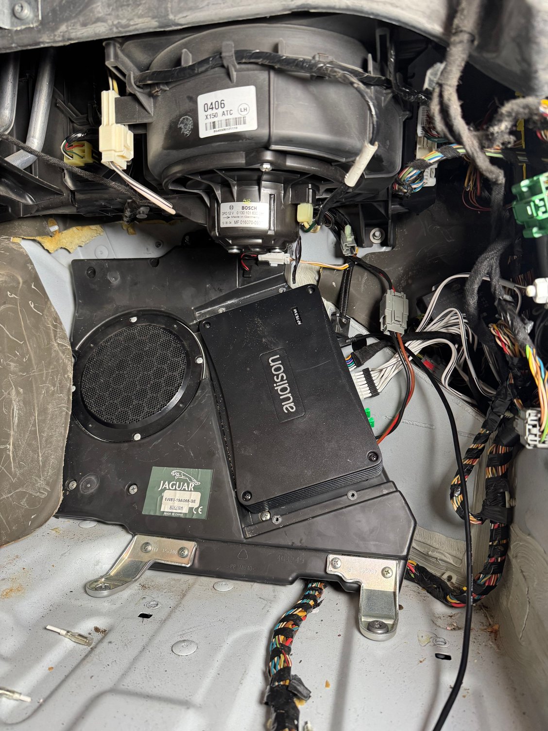 For the speaker connections - I stripped the wires on the connector in the car a bit and connected the output of the amp to the wires of the speakers. My created input cable (using 3rd party amplifier and had a spare connector) (4 channels input) The location where the original power plug (CA115) is tucked away (it has a false female plug on it) - and the other plug is the AMP FAN plug (if using Jaguar Premium amp)