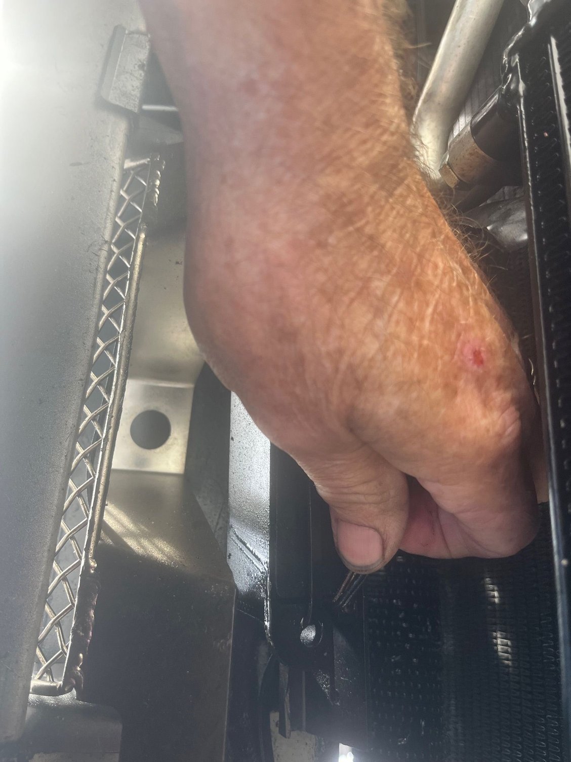I know the photo is bad. It was taken from underneath the car looking up. The bumper cover is on the left and the cooler on the right