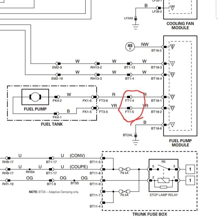 The fuel pump regulator (FPR) receives info from the ECU about how much fuel (pressure) to provide to the rail (don't worry about all that right now) then powers the pump... The regulator is a little silver box on the RH side of the trunk/boot. Remove (as best as possible) the carpet cover covering the stereo and nav system and you will see it (see photo). There is a red (R) and yellow red (YR) wire coming out of it. It's as simple as melting back a little of the YR insulation and twisting a wire into what is exposed and finding a suitable ground.