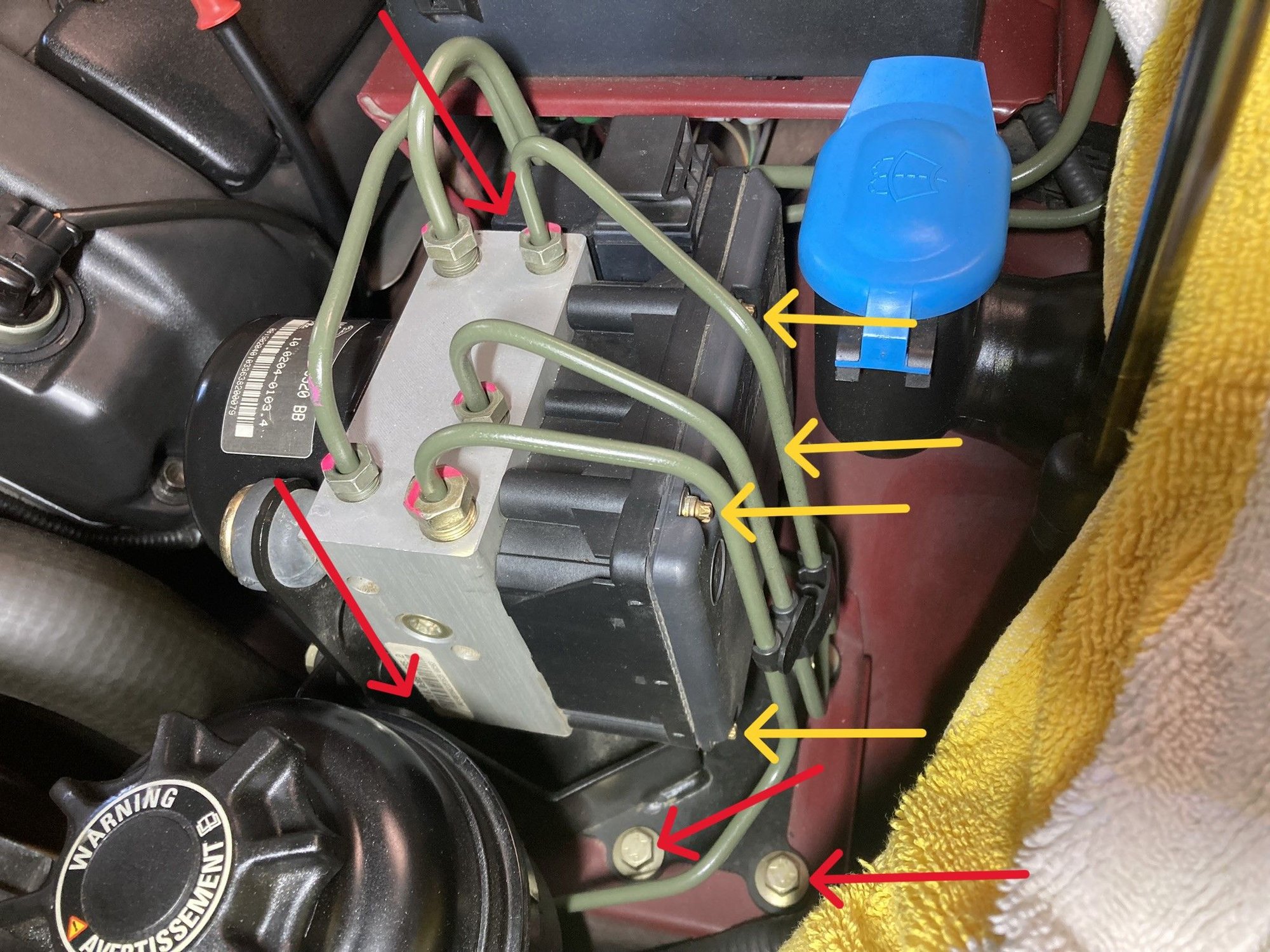 2) You only need to unbolt the 4 bolts holding the bracket to the car, and the 4 torx bolts securing the module itself. (No need to remove any other bolts or screws or the power steering reservoir, as that won't give you any more working space to remove the ABS module. I had to gently bend the metal brake lines slightly and maneuver the module quite a bit. If you're careful and diligent, it will come out.