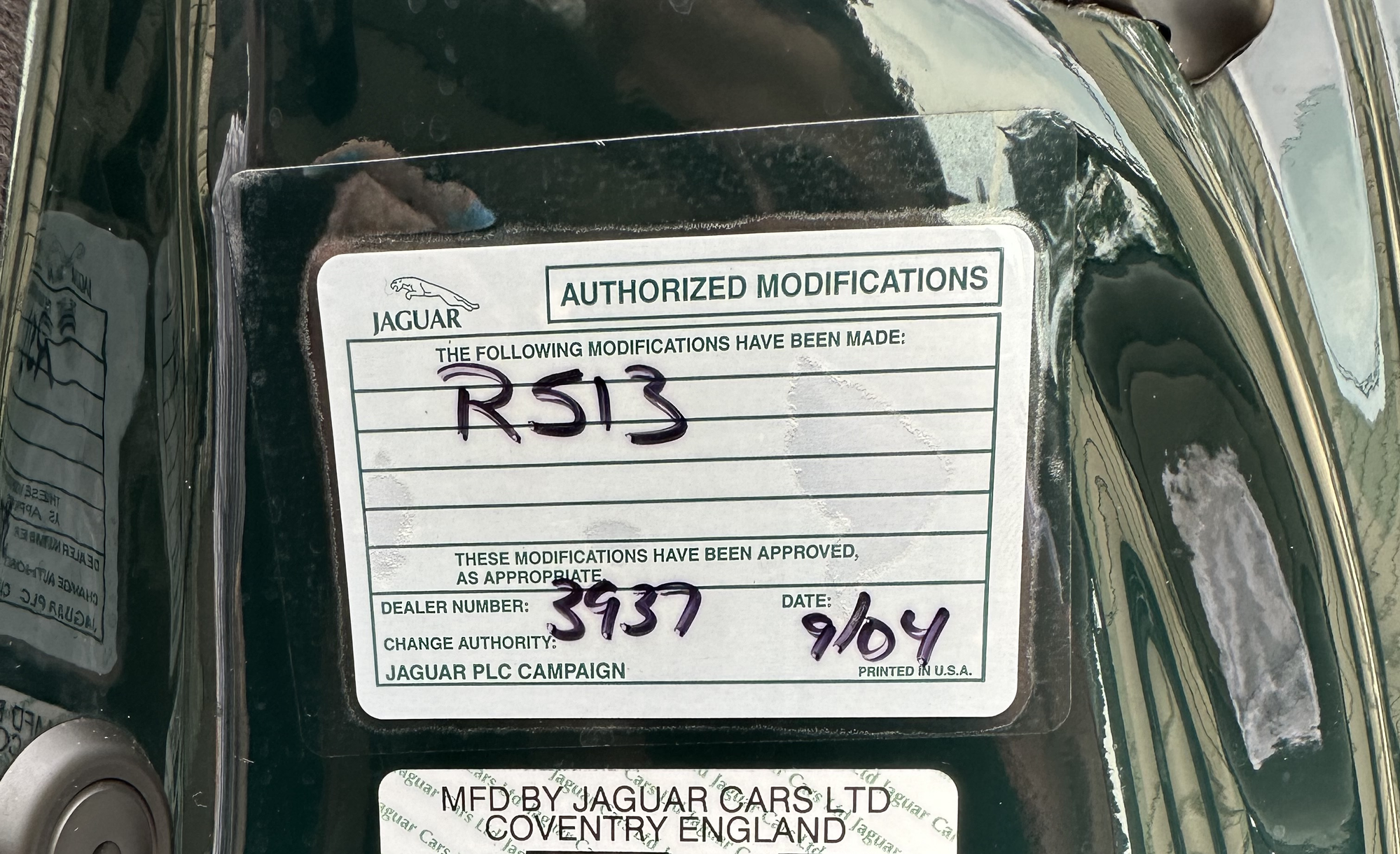Have this sticker on the door jamb on my 03' XKR conv in the US. Looks like dealer did something and marked it in 04' back when it was nearly new - says "RS13" I think. Any guesses what it might mean? Only non-stock things on it that I'm aware of are the Milan BBS 18" that I don't even think are for the XKR... and a front grill I had assumed was aftermarket.