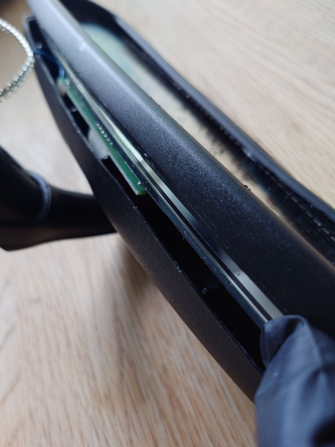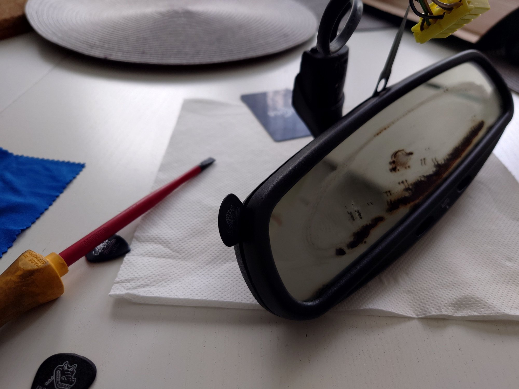Top Tip: crack open the mirror housing at the top and sides, enough to reveal the two sheets of glass within. Mine was firmly epoxied at the bottom edge resulting in cracking/breakage had I pushed things too far.