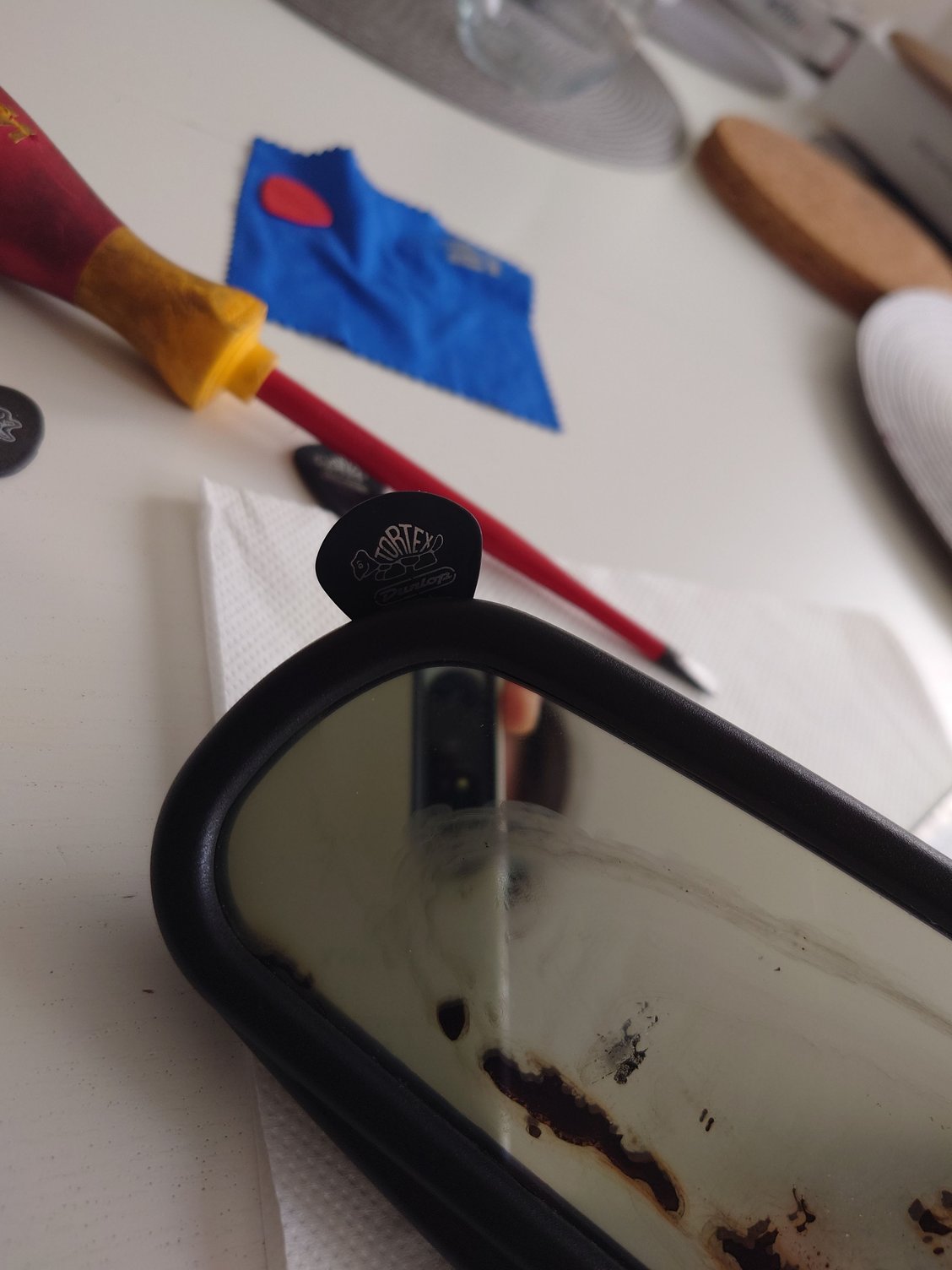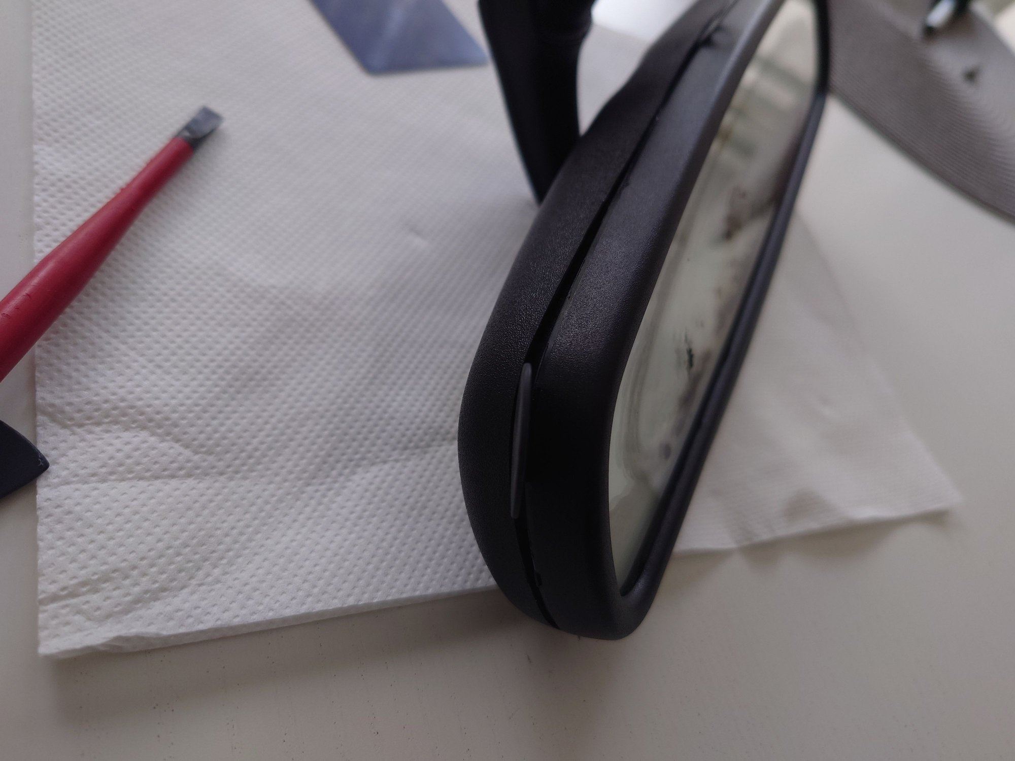 3. Pry open the mirror housing. This part was not all that fun. I started at the top using various implements to crack it open and release the adhesive. Avoid screwdrivers and/or metal tools as the plastic frame mars and deforms easily - I opted for a variety of guitar picks of varying thickness, but it should be something that can be "twisted" to open the gap.
