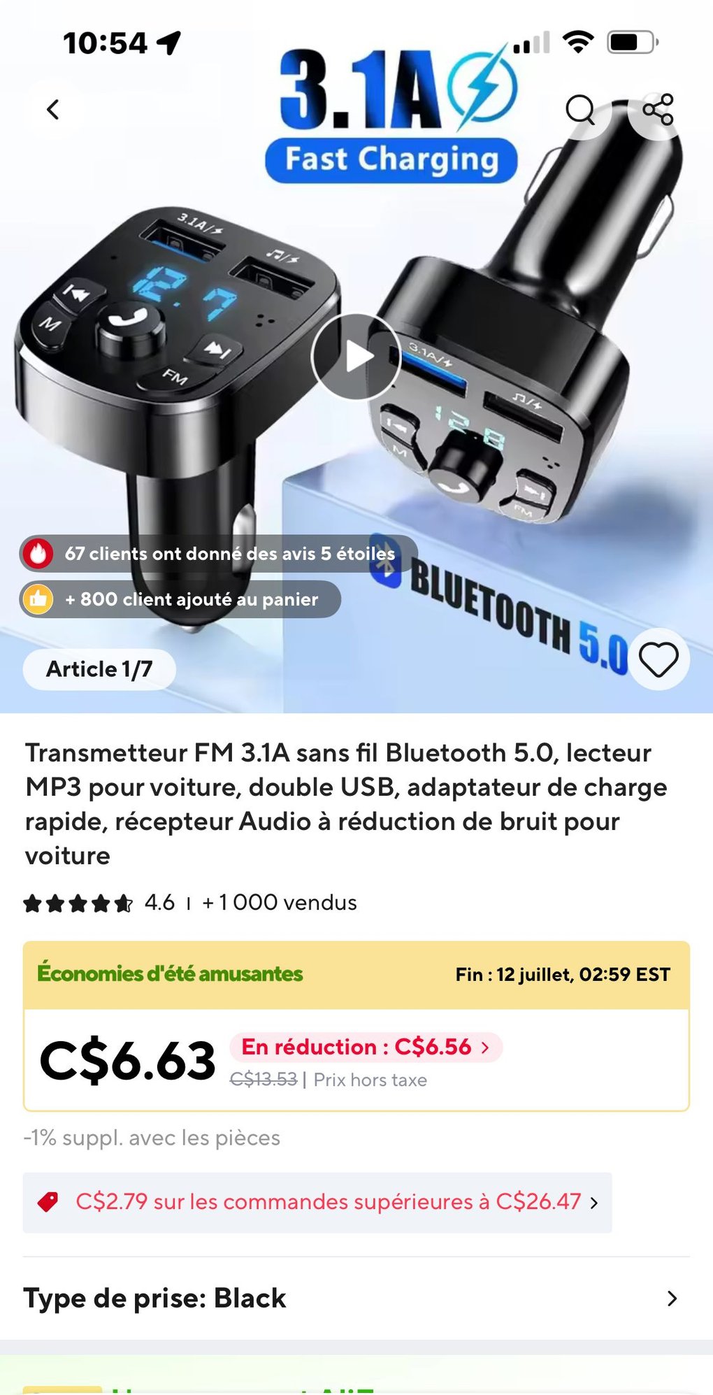 Je viens de trouver ça sur AliExpress : C$13.53 | Transmetteur FM 3.1A sans fil Bluetooth 5.0, lecteur MP3 pour voiture, double USB, adaptateur de charge rapide, récepteur Audio à réduction de bruit pour voiture