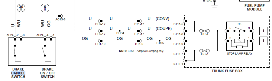 it shows all the connections between the brake switch and the CATS module so it should be possible to work out where the split is. Either way a test wire run from the brake switch to the relay will probably keep the CATS module connected, unless the fault is right at the back of the car - which would then be a good clue as to where the fault is.