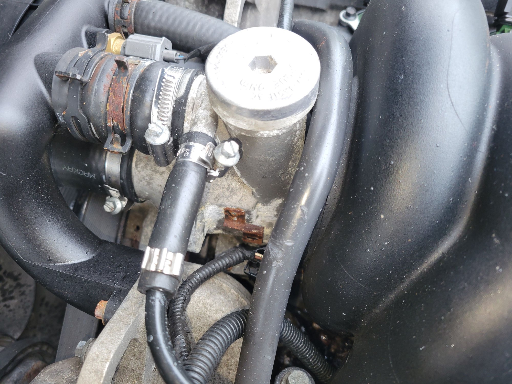 I hear air escaping but from the opposite side of the reservoir. the passenger side. (left side drive car) its like gurgling sound. like when you blow into a glass of water with a straw. Between the valve cover and firewall. Just hard to tell. I'm assuming its not the cap because I'm using a different cap to pressure test. Thanks