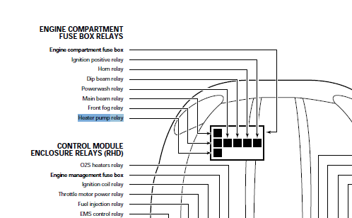 Here's the circuit for the heater pump. The circuit is protected by engine compartment fuse box Fuse #15 (10A):