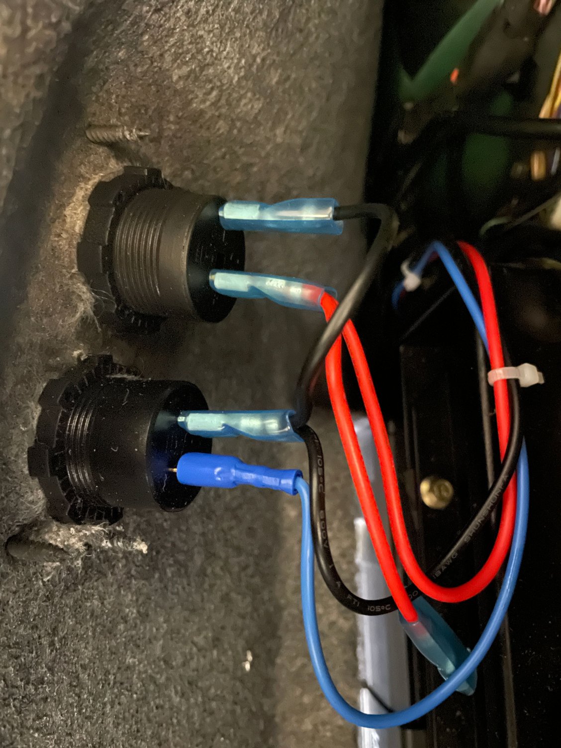 All that was now left to do was push the insulated connectors one to the appropriate male contacts in the aux socket and install and wire up the ports/cigar lighter as you can see in my previous post.