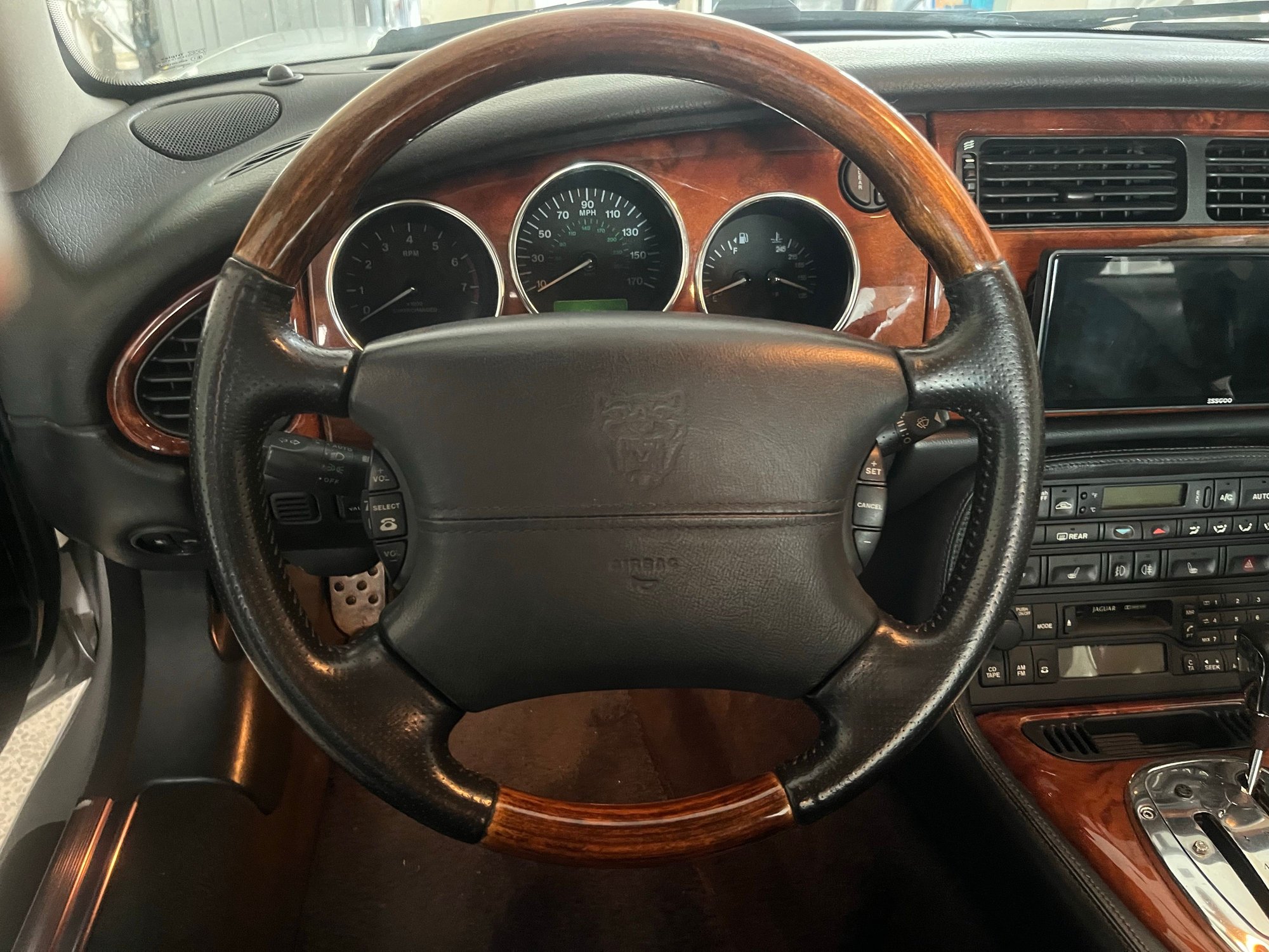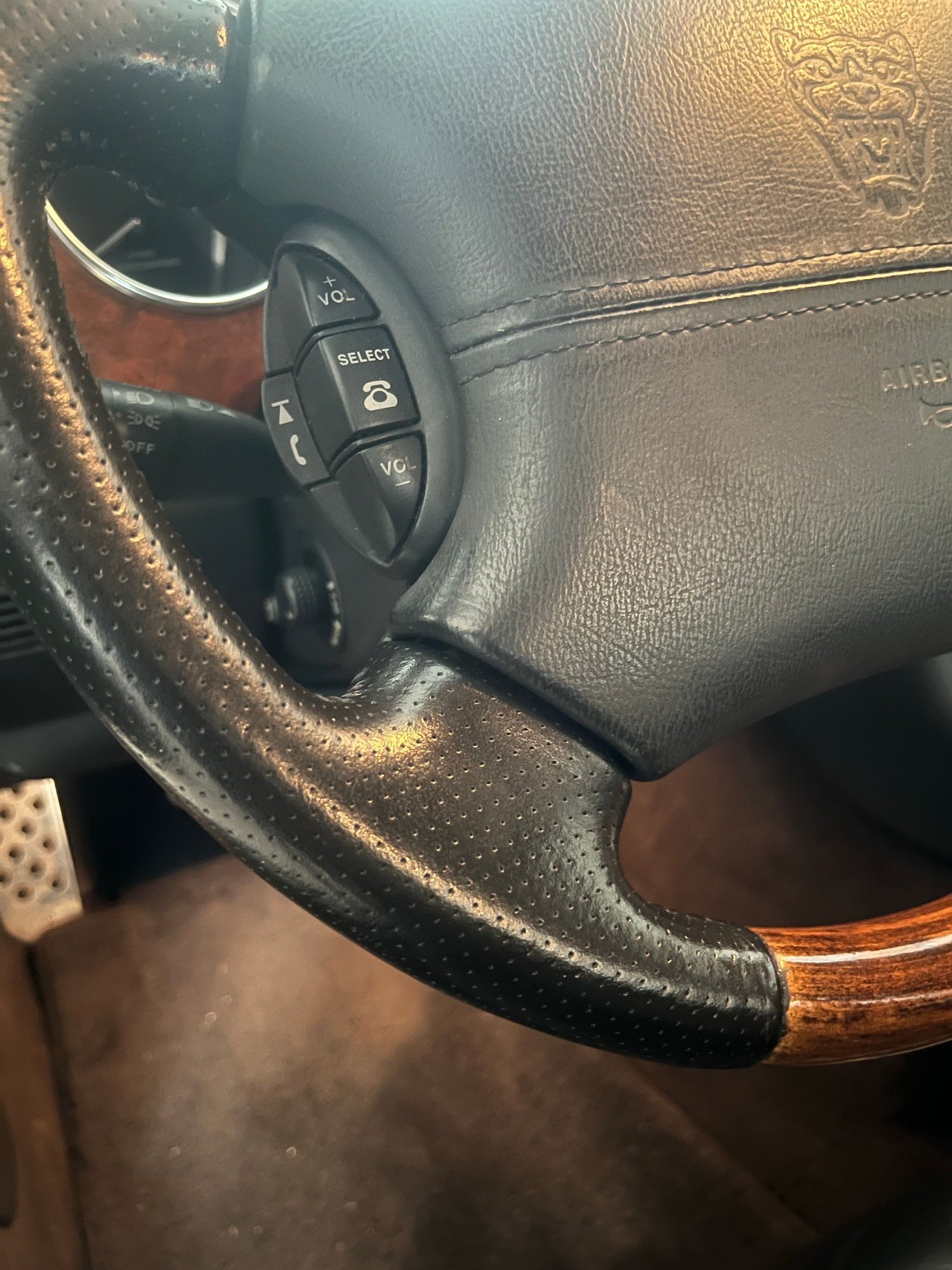 It is a factory steering wheel, it's just that I think it's from an XJR or an XJ8. The XKRs that had the perforated leather steering wheels, I think, didn't have any wood on them.