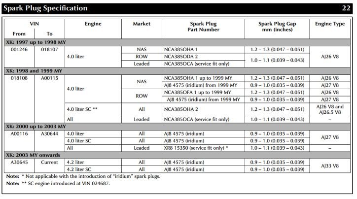 Wow, perfect timing. I'm taking my CAT for Plugs and fuel filter change. Thank you for your support. I need to ensure my mechanic knows about not to over tighten. Ok, for my 2005 XK8 VIN X52A43421 what would be the recommended Spark Plug and its gap? The provide info shows 2003 and onward....would this be for mine? thank you, please keep the good work for us to enjoy out CATs