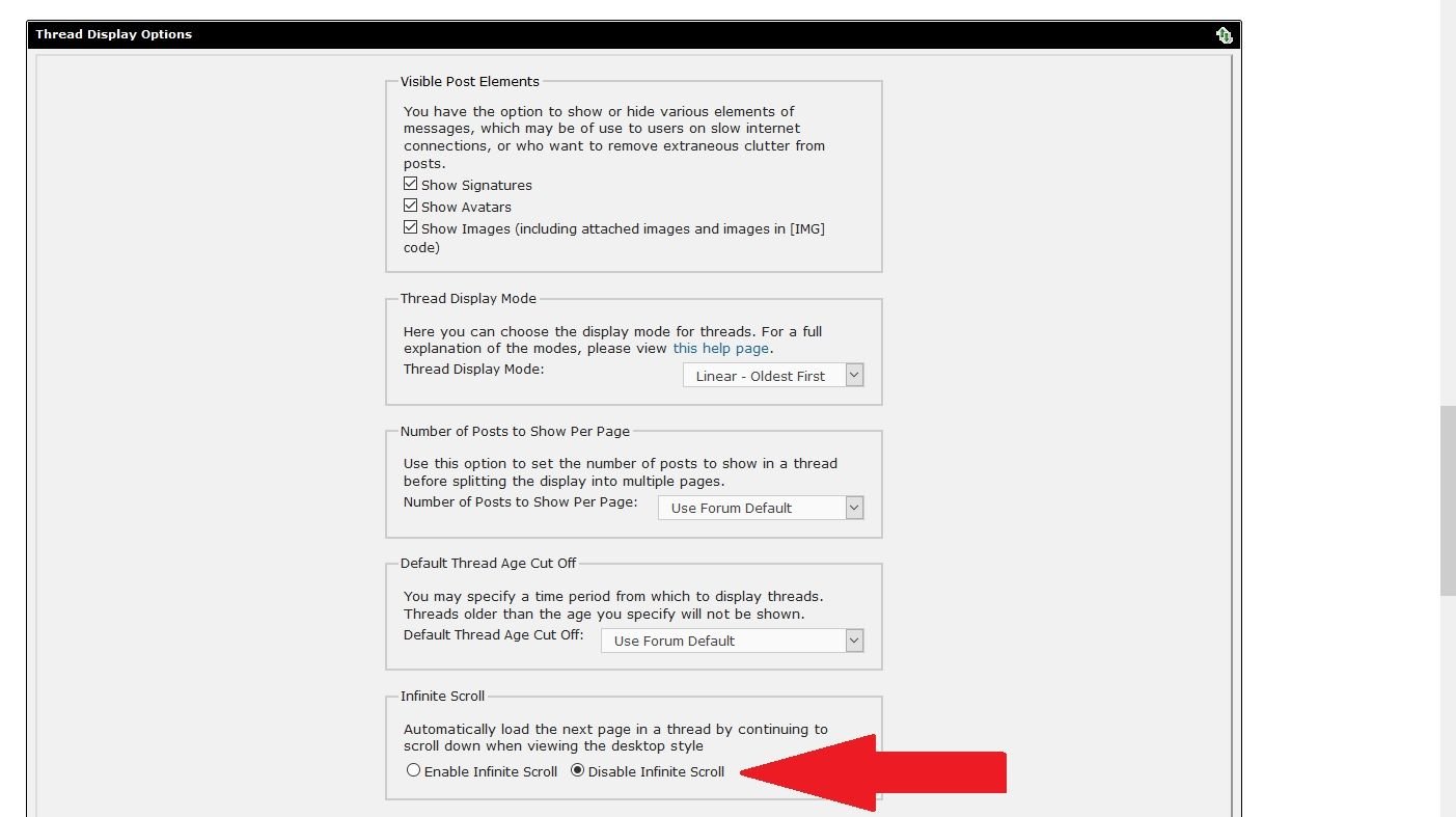 Go to User CP - Your Control Panel - Settings & Options - Edit Options. Go down to the Infinite Scroll option box and check Disable Infinite Scroll. Finally go all the way down to the bottom of the screen and click on the Save Changes button. You will no longer see ancient threads in your browse.