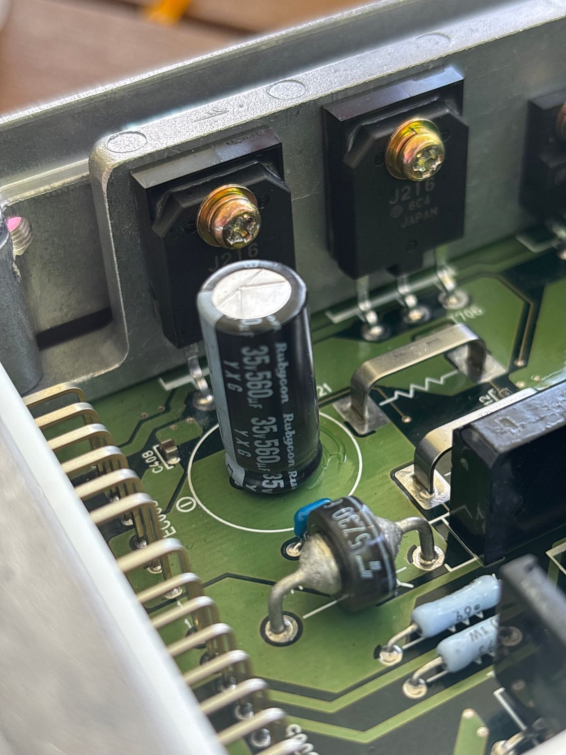 I looked into the ECU after the repair and found one capacitator should have 50V 560uf according to my research and the put in a 35V 560uf. Could it be a wrong capacitor? Maybe it was previously repaired with a wrong capacitor and they simply replaced it with the same one. And I found one not so nice spot between the capacitors.